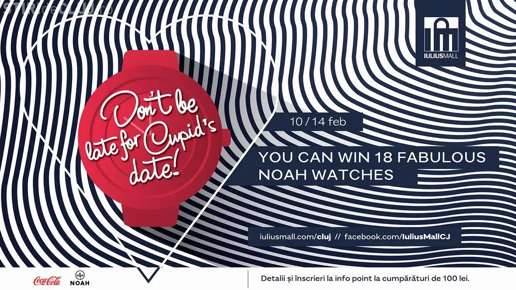 Pe 14 februarie, în intervalul orar 12.00 – 20.00, Cupidon de la Iulius Mall Cluj a stabilit nouă ore și tot atâtea locuri pentru întâlniri pe nepregătite. Fiecare cuplu înscris va primi sms cu invitația jucăușului personaj, în care vor găsi indicii privind coordonatele întâlnirii la care au fost programați. Vor avea la dispoziție o oră și jumătate pentru a ajunge la Iulius Mall și a identifica locul specificat. Atenție! „Don`t be late for Cupid`s date”! Primele trei cupluri care ajung la întâlnire, la ora și locul indicat, se vor întrece pentru a câștiga o pereche de ceasuri Noah, pentru el și pentru ea, pe care le pot personaliza așa cum își doresc. Mai exact, vor trebui să își arate îndemânarea în aruncarea săgeților pe un panou în formă de ceas, iar cei care vor ținti, dintr-o singură încercare, cât mai aproape de ora la care au fost chemați la întâlnire vor fi marii câștigători ai accesoriilor fashion. Perechile mai puțin norocoase, dar care nu au ratat întâlnirea, vor fi răsplătite pentru dragostea lor cu bilete la Cinema City și vouchere la Donuterie.