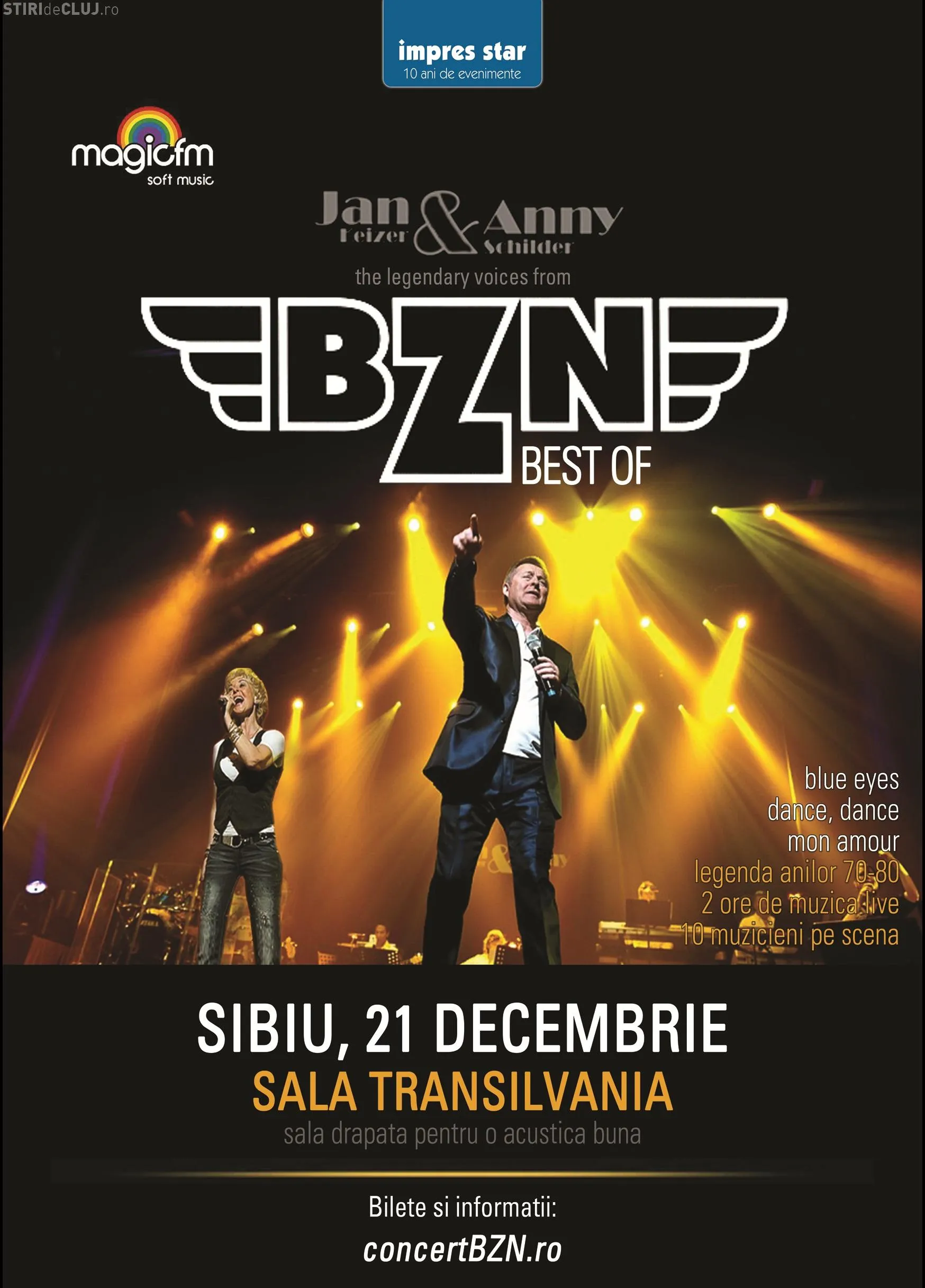 Intre melodiile celebre ale acestei formatii se numara "Blue Eyes, Blue Eyes", "Dance, dance" sau "Mon Amour". "Toti le-am fredonat melodiile, indiferent de varsta. Unii dintre noi si-au inceput povestea de iubire pe muzica lor, altii exista astazi datorita lor iar majoritatea ar da orice sa-i vada live in concert. Pentru noi toti, in data de 21 decembrie, la Sala Transilvania din Sibiu, va avea loc un concert extraordinar al legendelor anilor 70 - 80, Jan Keiser si Annie Schilder, solistii trupei BZN", precizeaza organizatorii.