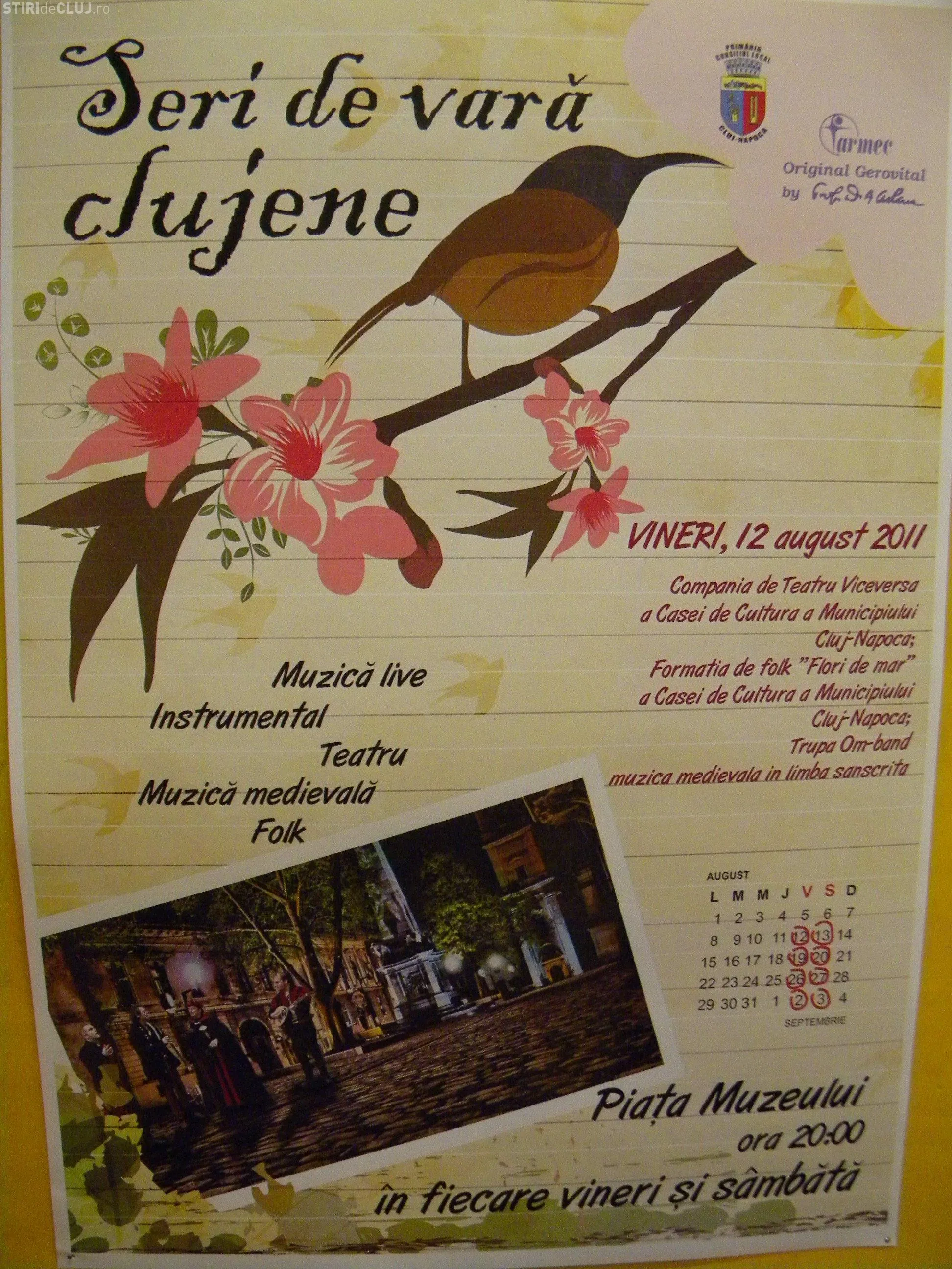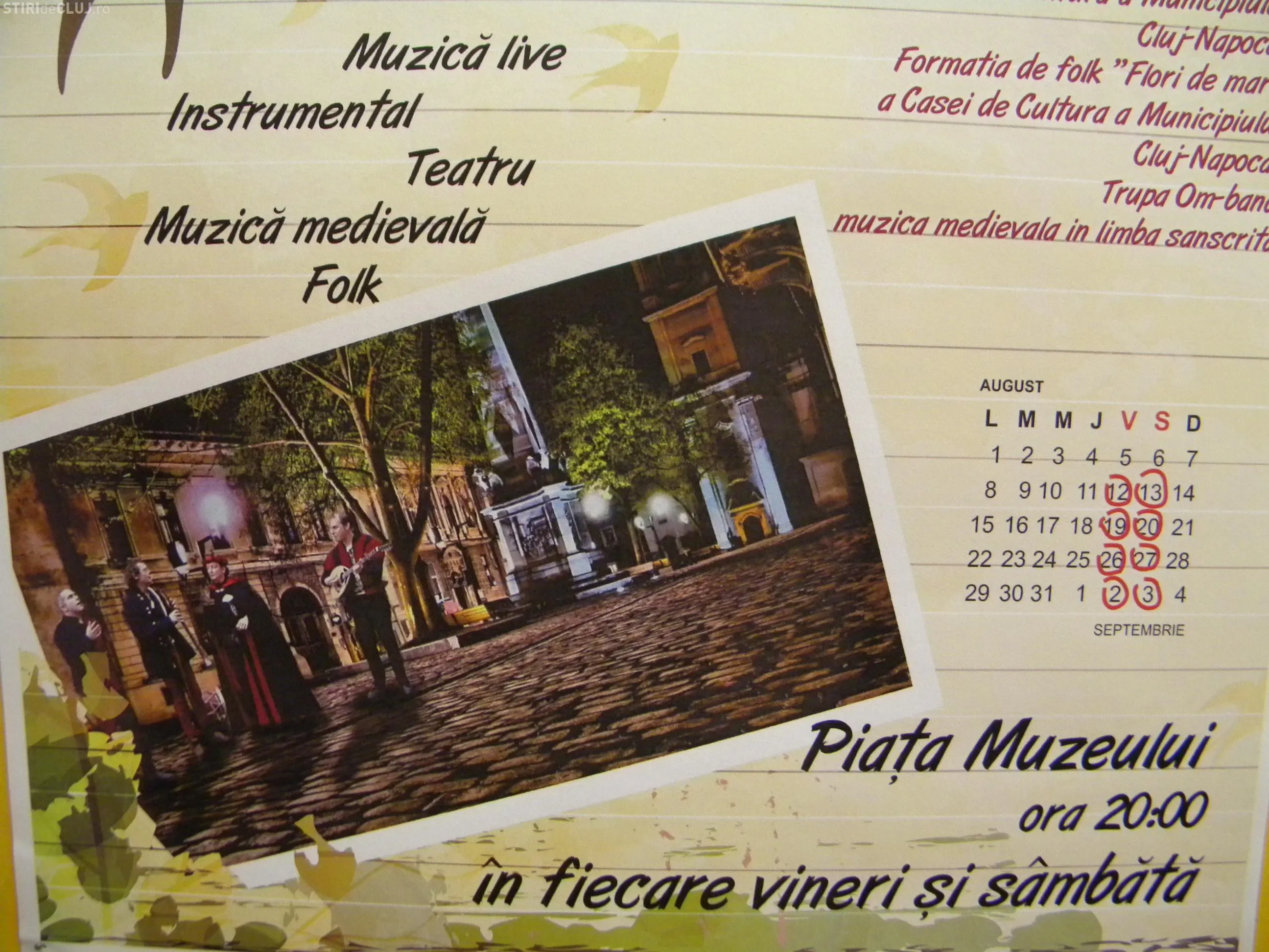 "Evenimentul presupune o serie de spectacole gratuite in serile de vineri si sambata ale lunii august, in Piata Muzeului. Spectacolele vor contine muzica live, instrumentala, dans, scenete de teatru, stand-up comedy. Prima reprezentatie va avea loc vineri, 12 august, ora 20.00, cand trupele 'Flori de mar', trupa de folk a Casei municipale de cultura, Om-band, muzica medievala sanscrita si compania de teatru Viceversa, de asemenea de la Casa municipala de cultura vor sustine primele spectacole", se arata intr-un comunicat de presa al Primariei Cluj-Napoca.