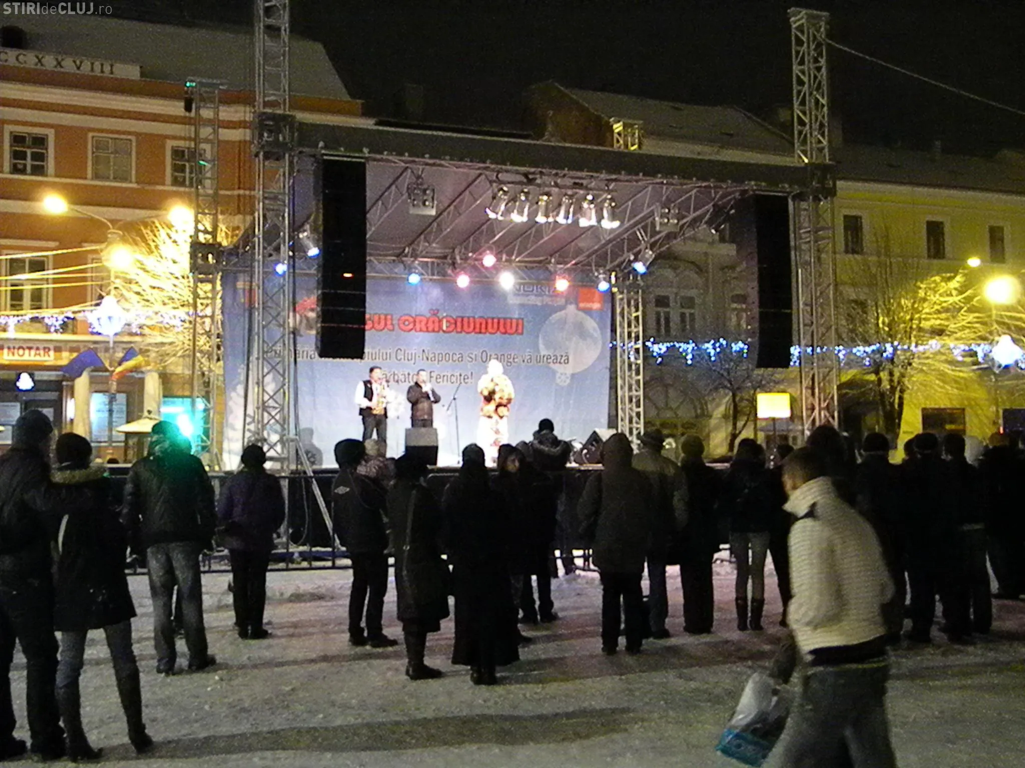 Cei 50 de clujeni care au fost la ora anuntata in Piata Unirii au fost aflat ca trebuie sa mai astepte o jumatate de ora si in cele din urma spectacolul a inceput la 19.00.