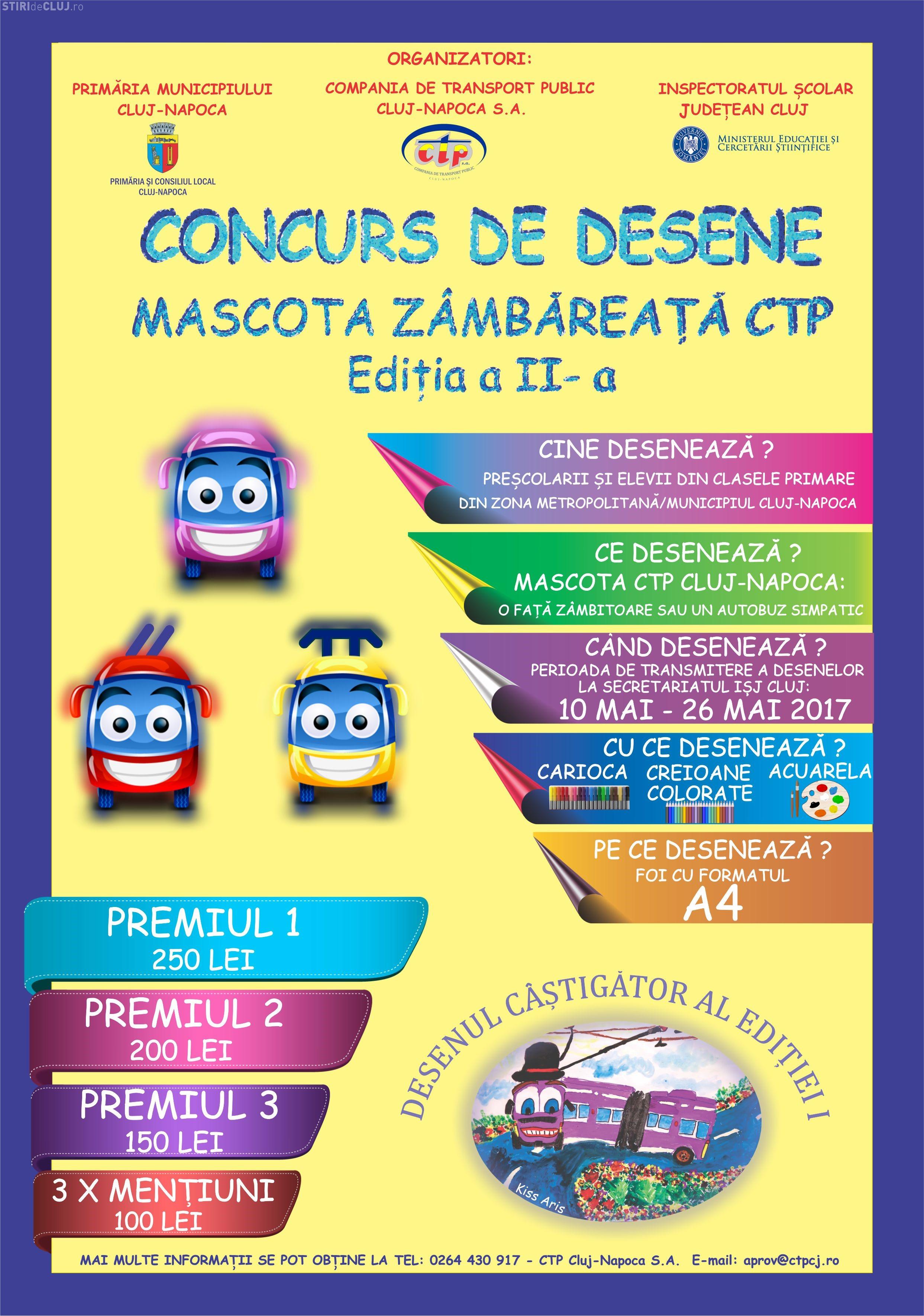 Perioada de transmitere a desenelor la secretariatul Inspectoratului Şcolar Judeţean este de 10- 26 mai. Preşcolarii şi elevii sunt invitaţi să creeze o nouă mascotă pentru Compania de Transport Public Cluj-Napoca, fie sub forma unei feţe zâmbitoare, fie a unui autobuz simpatic.