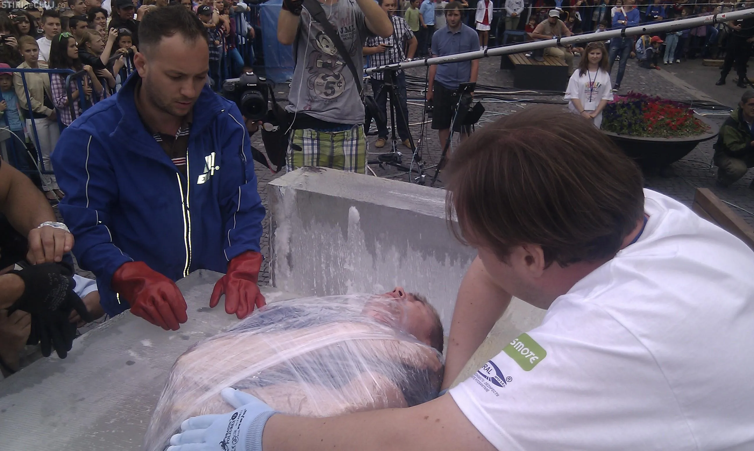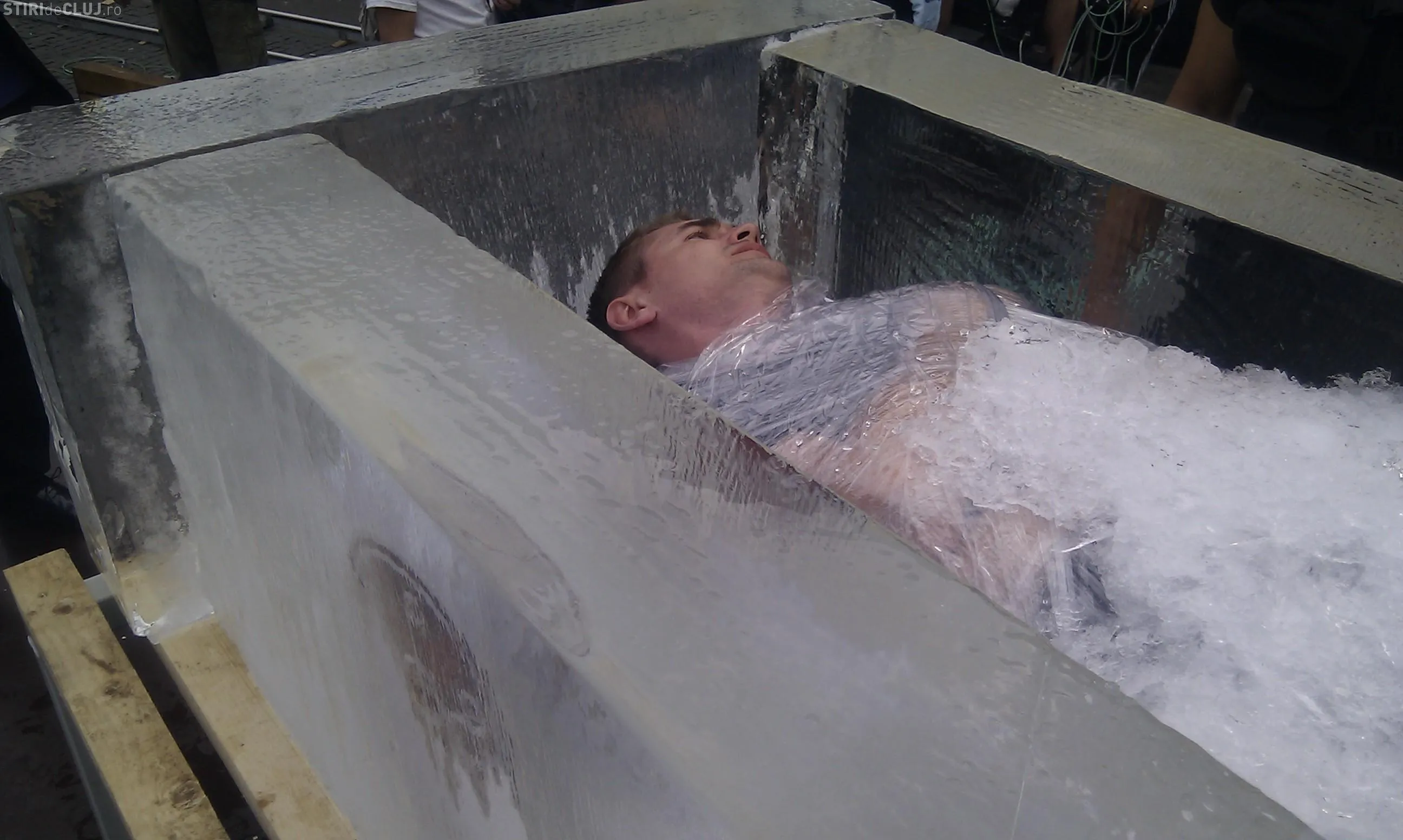Recordul mondial este de doua ore si 34 de minute, petrecute in gheata.