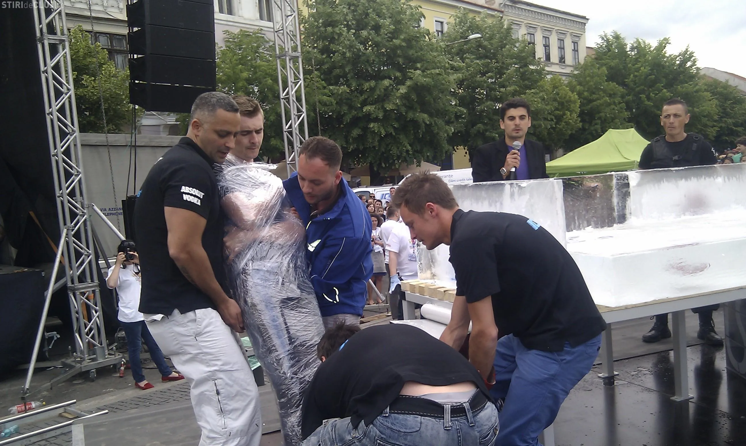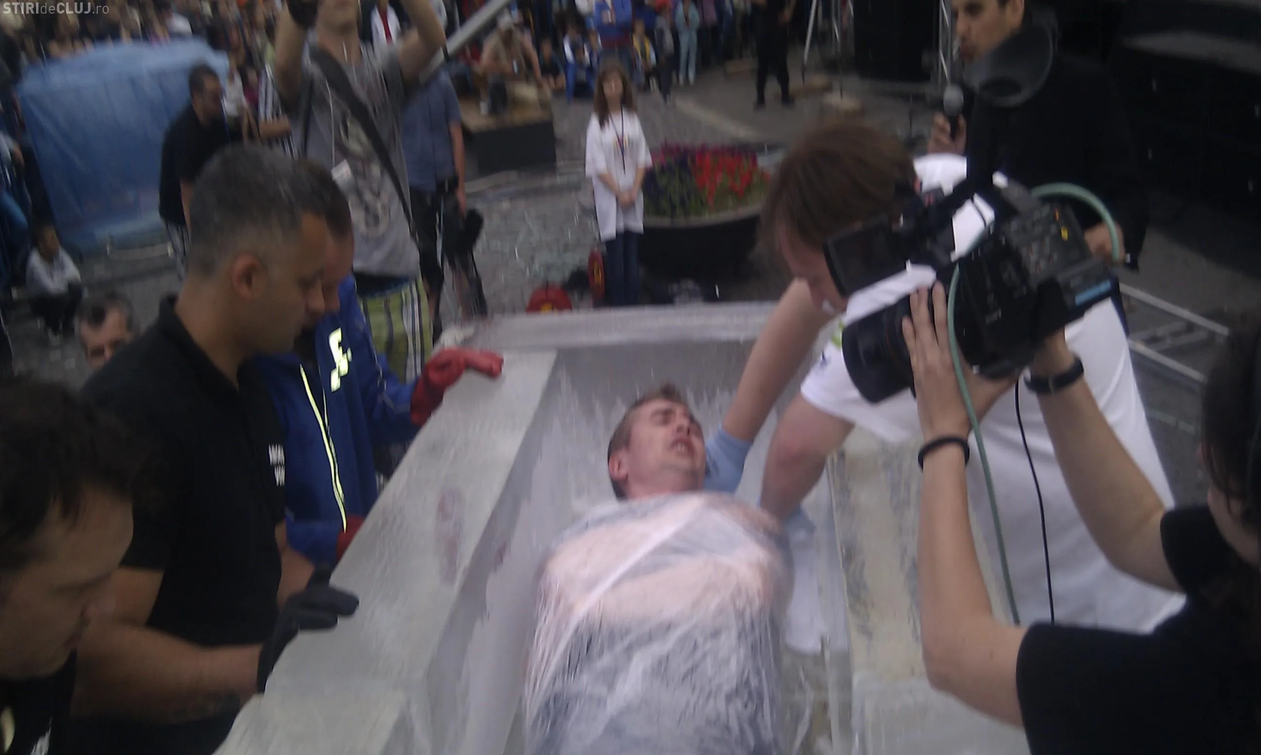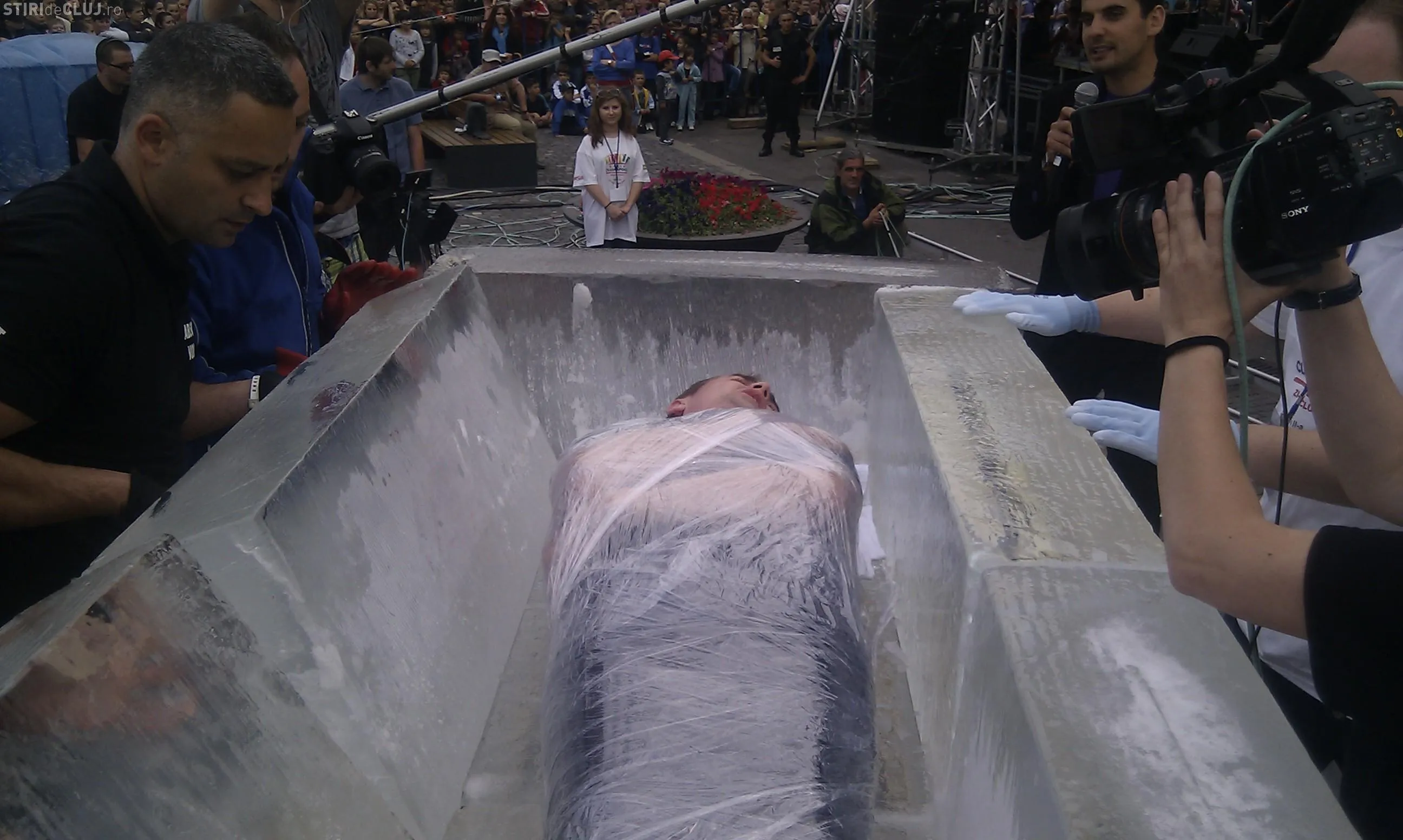 Cristian Gog a depasit recordul mondial de 2 ore si 34 de minute. Acesta se afla si in acest moment (n.red. 21:16) in "sicriul de gheata" amplasat pe scena din Piata Unirii.
