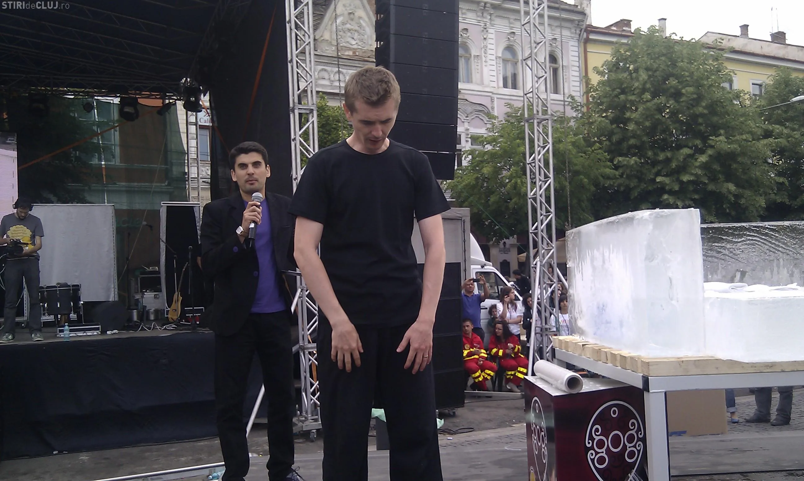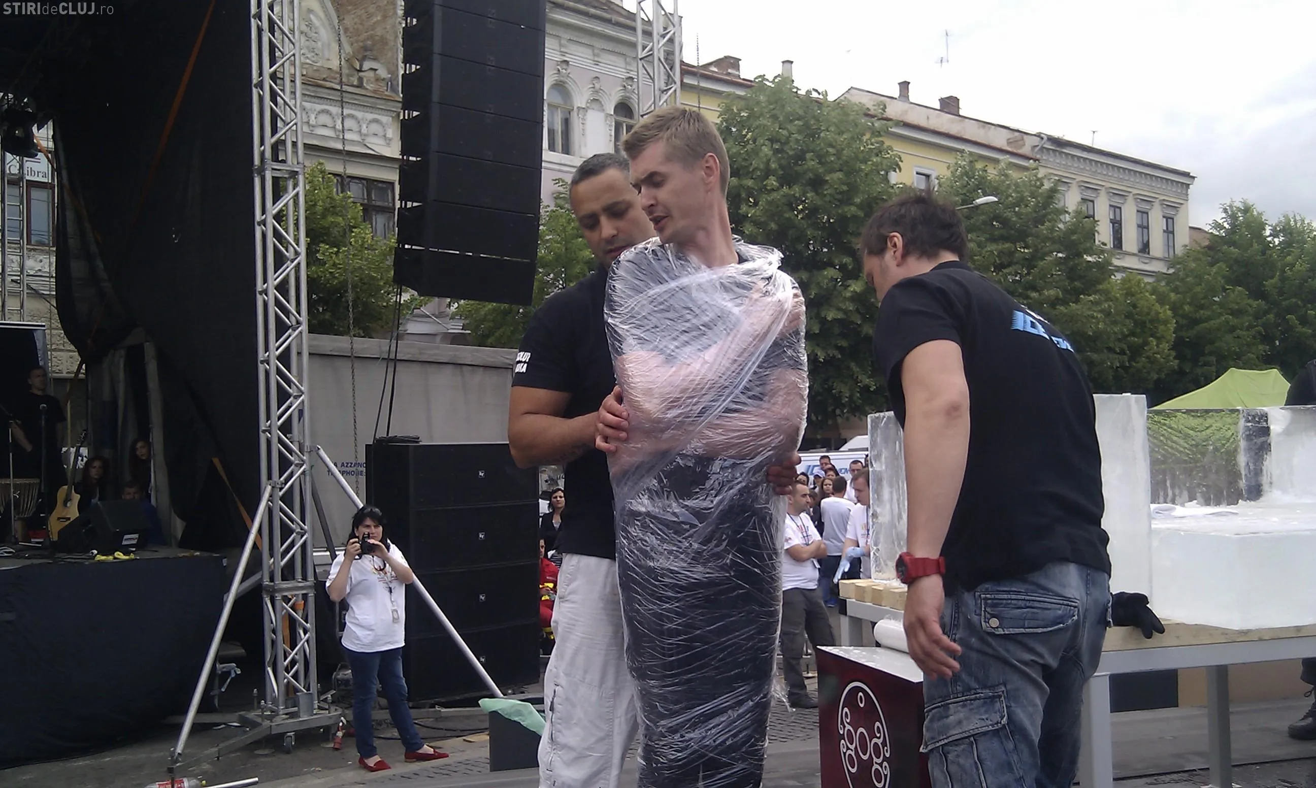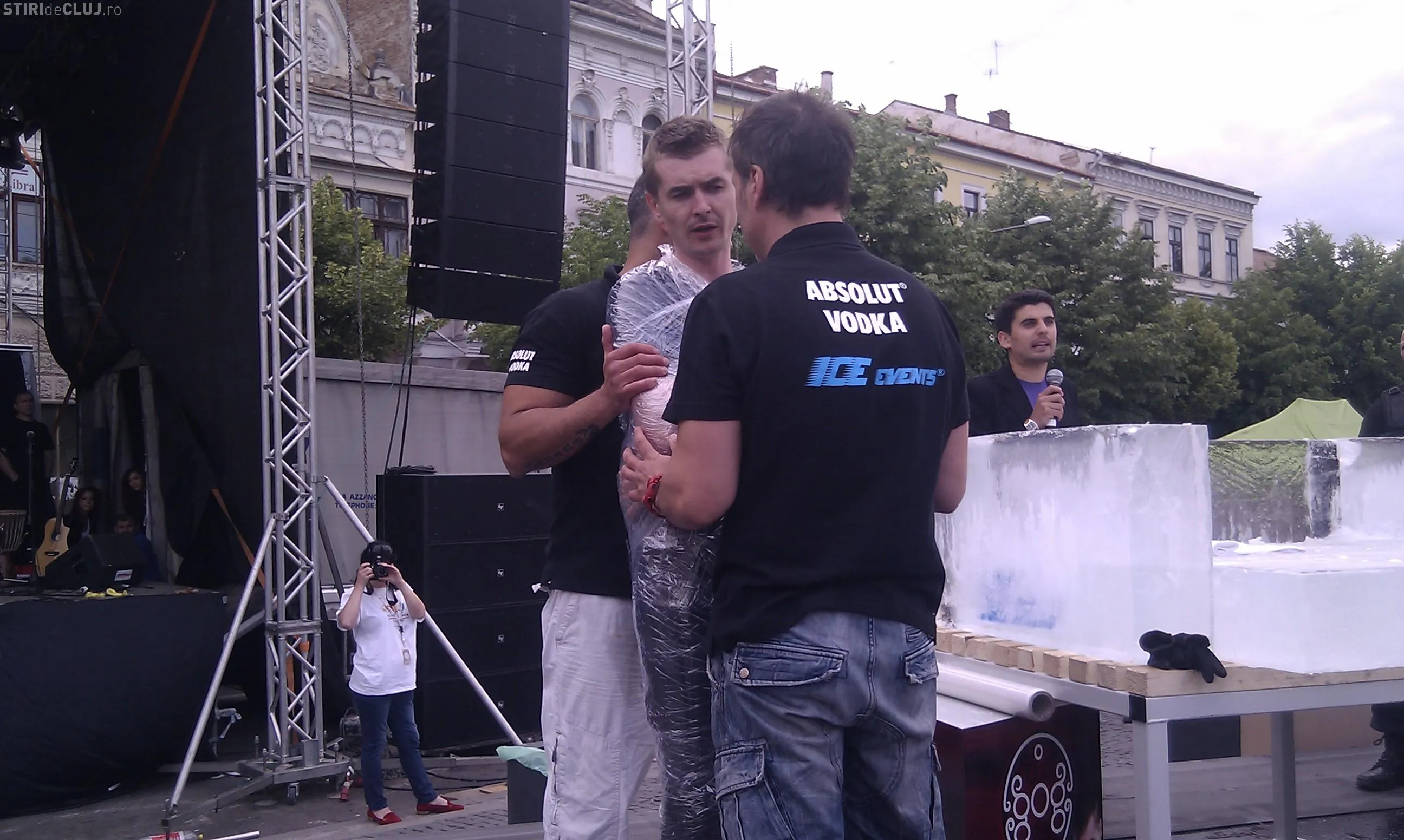 Cristian Gog a depasit recordul mondial de 2 ore si 34 de minute. Acesta se afla si in acest moment (n.red. 21:16) in "sicriul de gheata" amplasat pe scena din Piata Unirii.