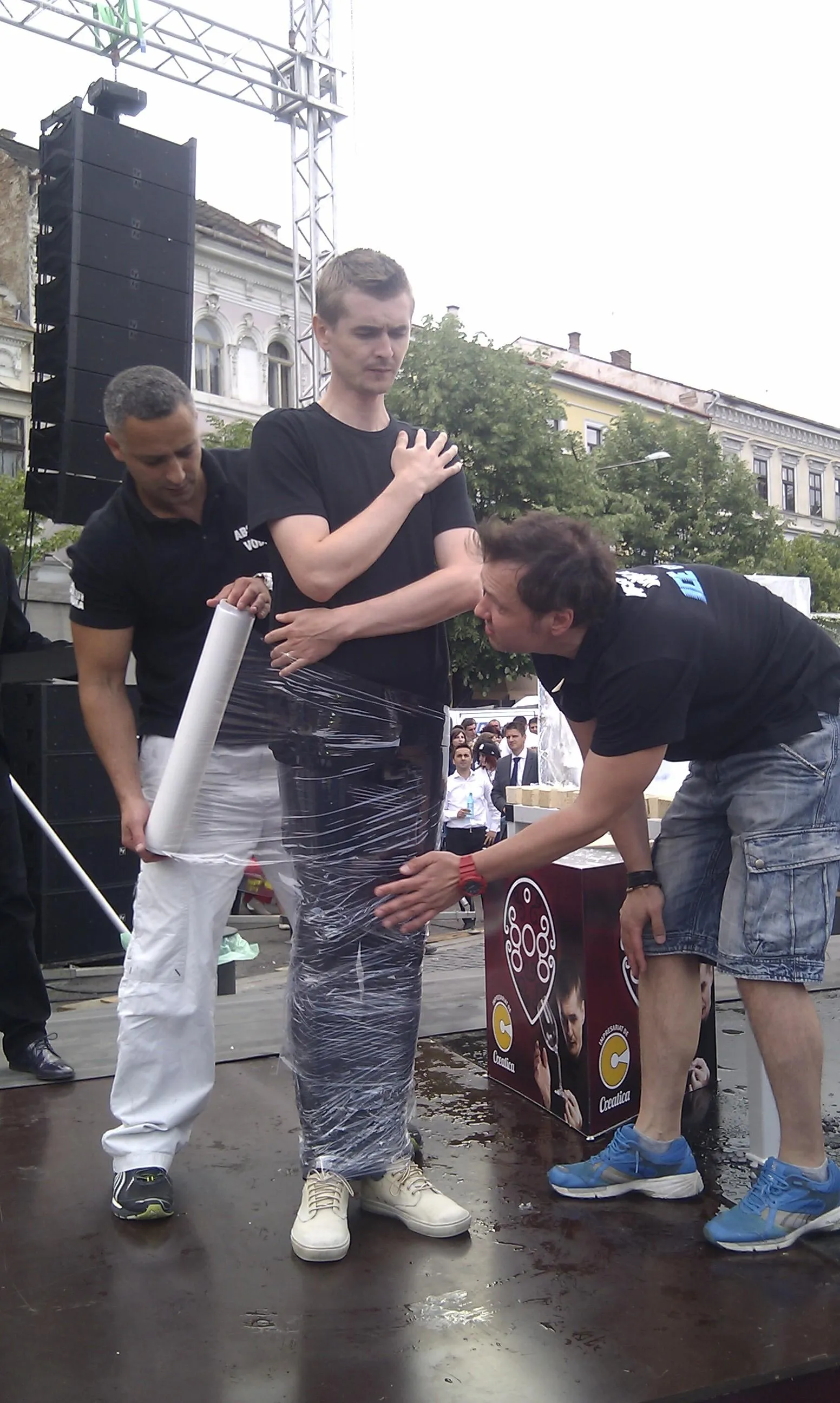 Mentalistul Cristian Gog s-a inchis intr-un "sicriu de gheata" in Piata Unirii. Imbracat numai intr-un trening subtire, Gog a fost infasurat intr-o folie de plastic transparenta si s-a pus in gheata.