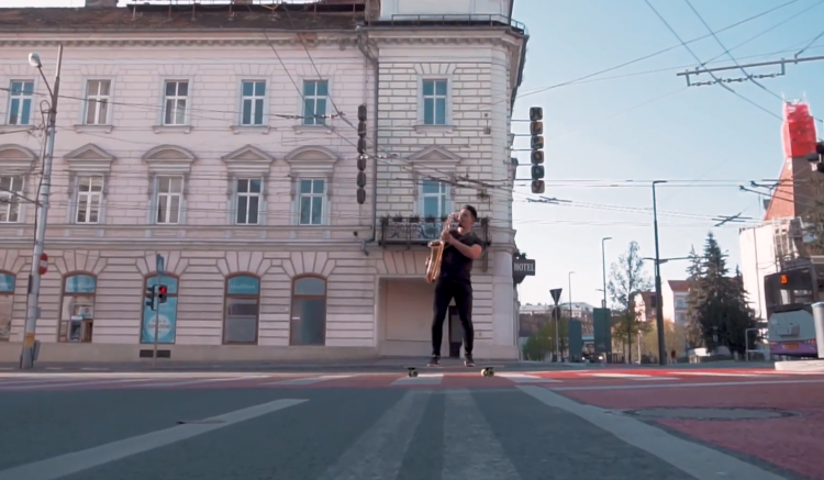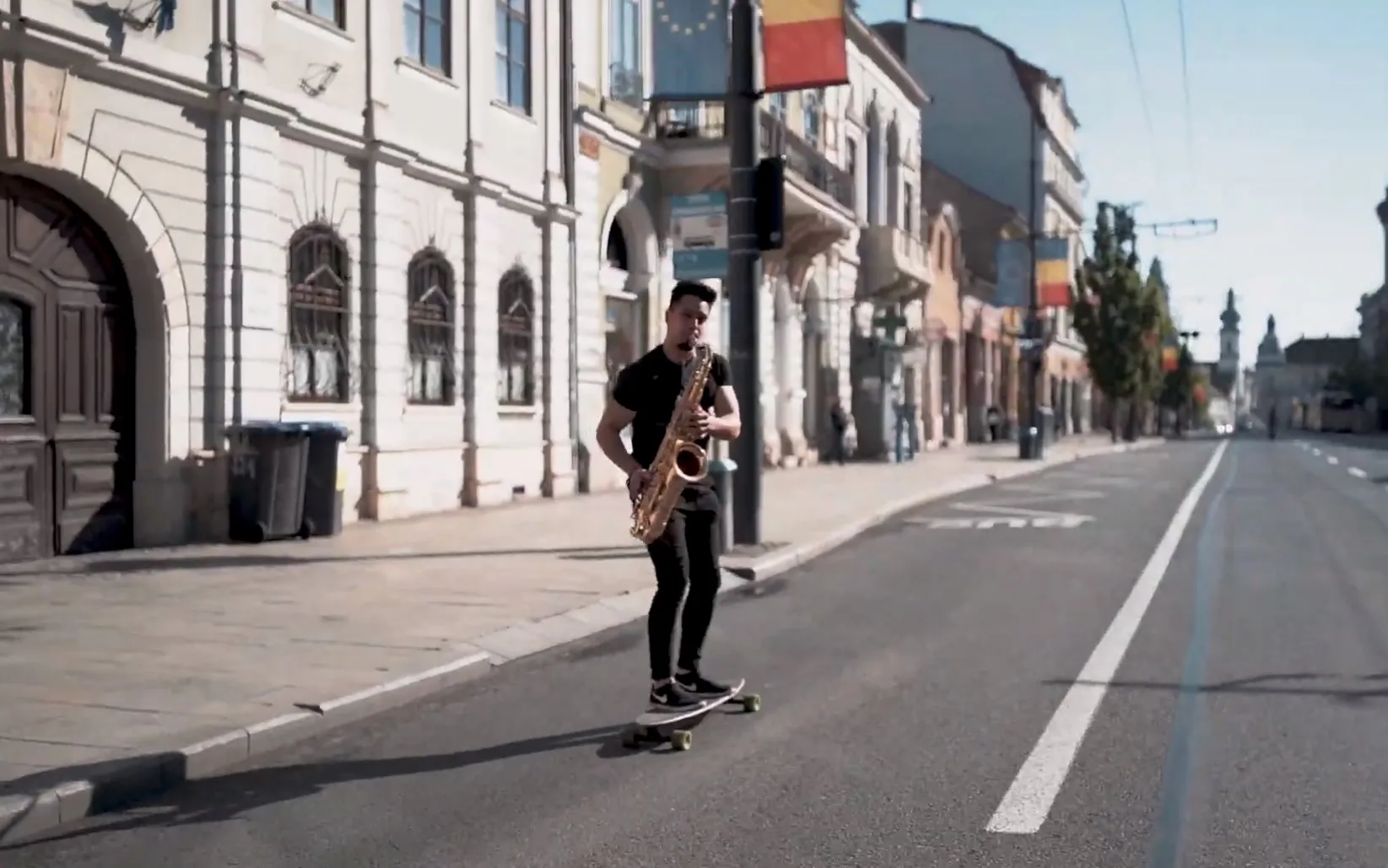 Un saxofonist clujean a realizat un clip în timp ce mergea pe skateboard, cântând la saxofon.