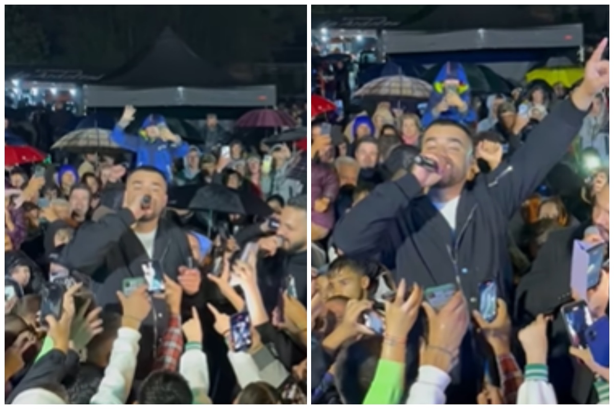 Interpretul de manele a dat scena pe public, cântând chiar din mijlocul fanilor, în ciuda ploii puternice.