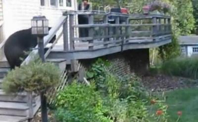 Un urs aflat în căutare de mâncare a ajuns pe terasa unei case din Minnesota, dar Nishanto, proprietara casei, a ieșit pe ușă și a început să strige, indignată, la animal.