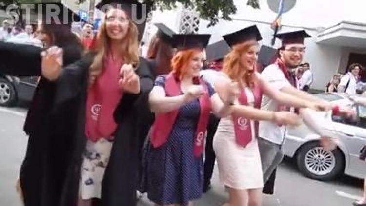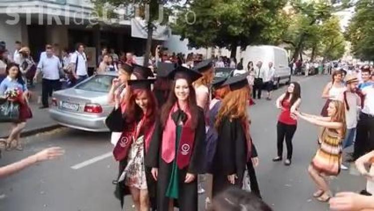 Mai multe tinere care au absolvit UBB Cluj s-au bucurat ”prestând” un dans chiar pe strada Kogălniceanu, lângă universitate.