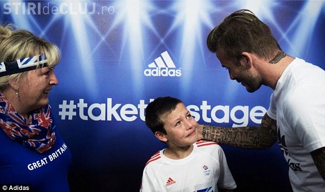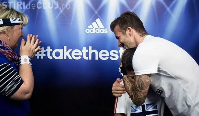 După ce a dat vărsat câteva lacrimi de emoţii, Beckham l-a îmbrăţişat pe Christian, apoi a făcut o poză cu băiatul şi cu mama acestuia.