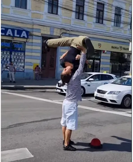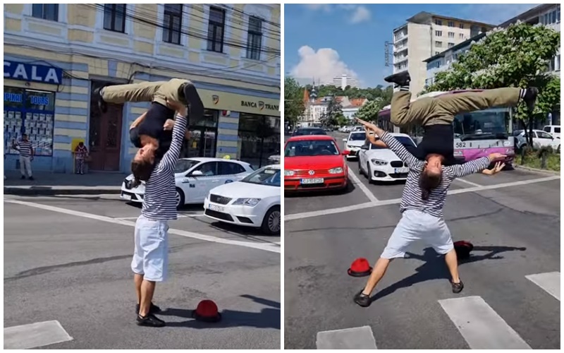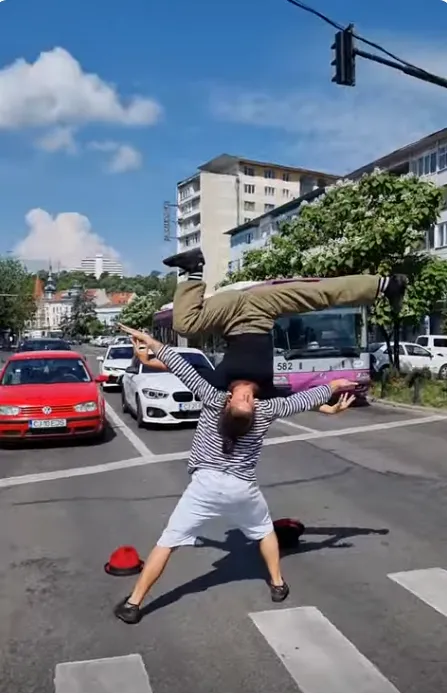 Doi acrobați au făcut spectacol în Piața Mihai Viteazu, pe trecerea de pietoni - VIDEO