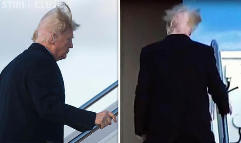 Frizura lui Trump este subiect de glume de mult timp, iar acum vântul i-a jucat feste, scrie The New York Post. În filmare apare Donald Trump în timp ce acesta se urcă în avionul Air Force One, iar o pală de vânt i-a răvășit părul.
