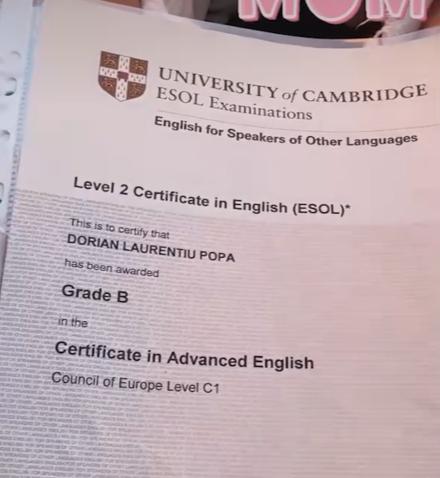 Influencerul a scos și dosarul Cambridge, unde se poate observa că Dorian Popa a obținut un certificat de engleză avansată, nivelul C1, în iunie 2006.