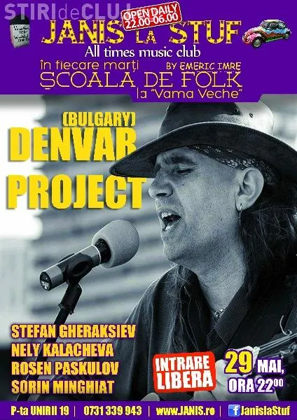 Marti, 29 mai, Scoala de Folk ii aduce pe scena pe Denvar Project, trupa originara din Bulgaria, de la ora 22.00. Vino in Janis la Stuf, in sala Vama Veche, sa ai parte de o seara de folk cu intrare libera.