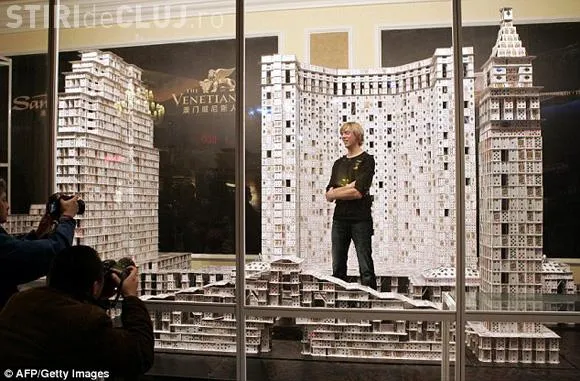 Un arhitect american a intrat in Cartea Recordurilor, dupa ce a realizat cea mai mare constructie din carti de joc din lume. La scurt timp, insa, a facut-o una cu pamantul.