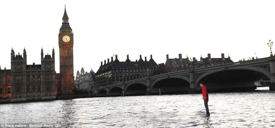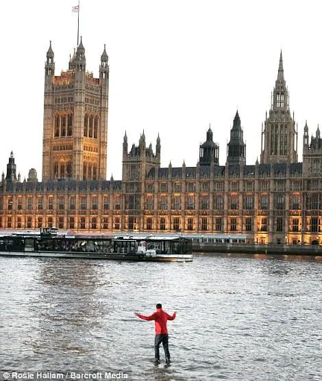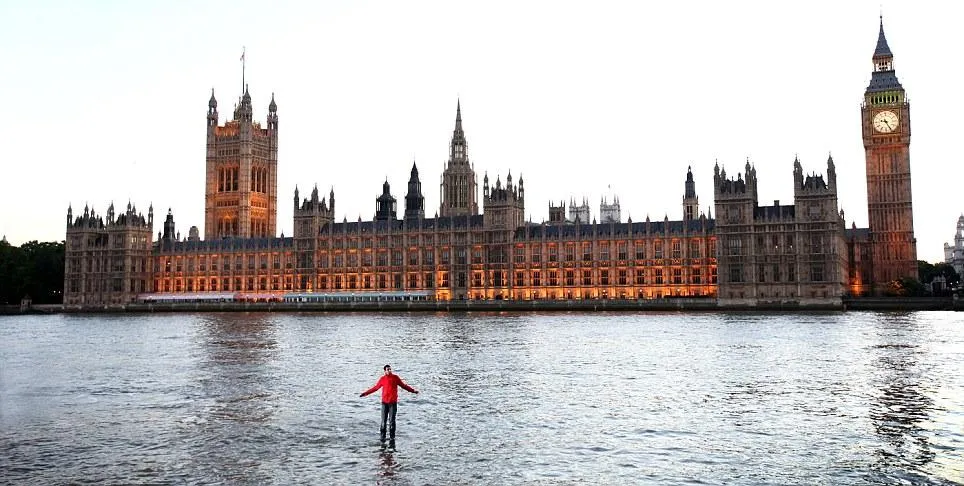 Steve Frayne, magicianul cunoscut sub numele de Dynamo, si-a demonstrat talentul unic si a mers pe apa raului Tamisa, in fata cladirii Parlamentului britanic.