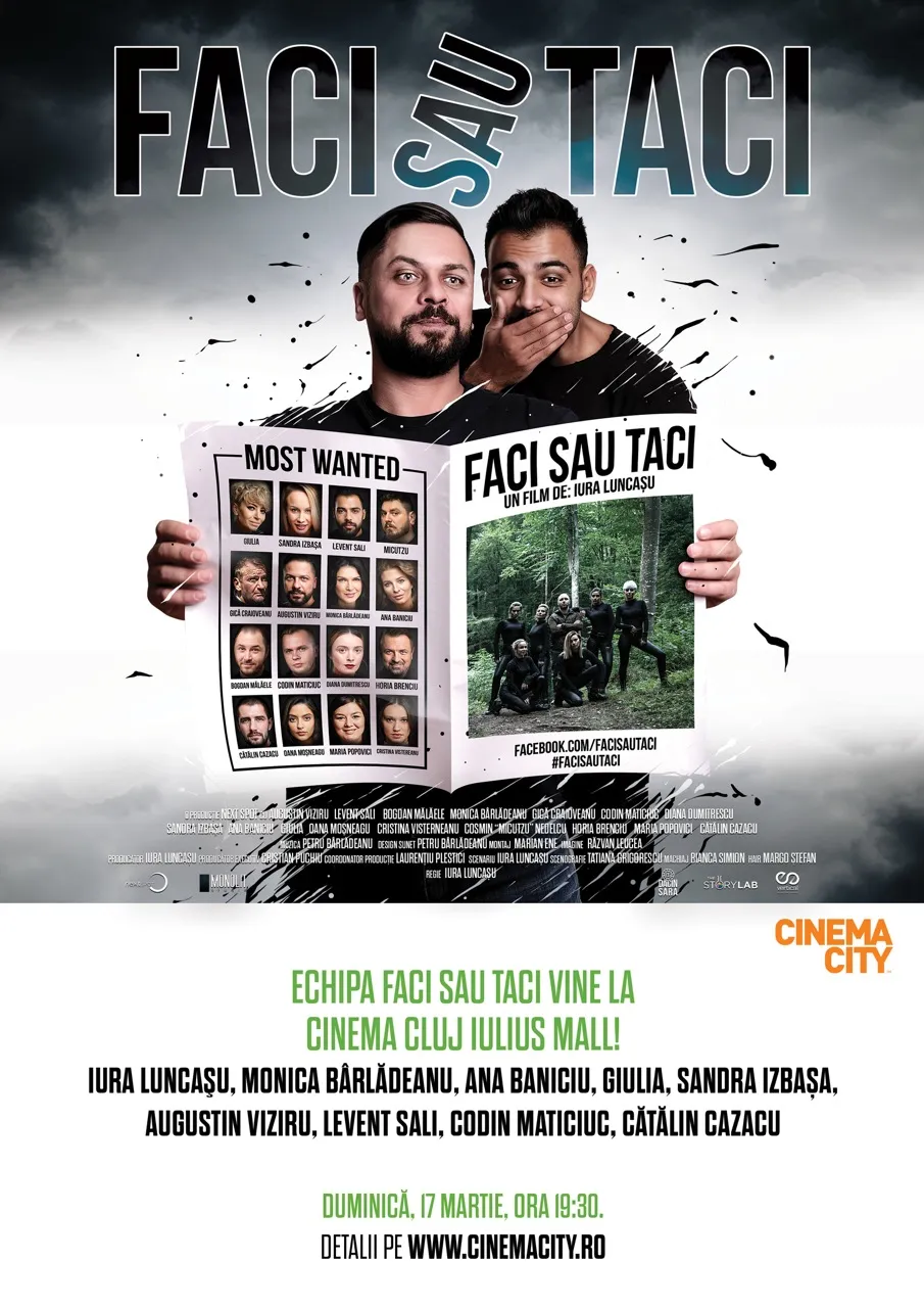 Echipa comediei ,,Faci sau Taci” îşi dă întâlnire cu publicul din Cluj pe 17 martie la Cinema City Iulius Mall, cu începere de la ora 19:30. Regizorul Iura Luncaşu şi actorii Codin Maticiuc, Ana Baniciu, Augustin Viziru, Levent Sali, Sandra Izbașa va asteapta la cinematograf la proiectia filmului pentru intrebari, autografe si mult ras.