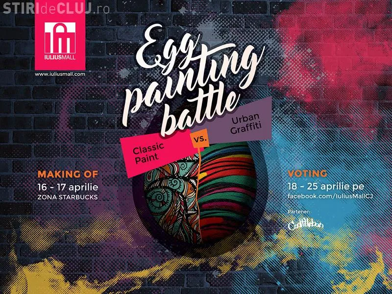 Iulius Mall Cluj promovează și susține arta sub toate formele sale, de această dată printr-un eveniment aparte. În așteptarea sărbătorilor, clienții vor avea șansa de a admira munca a opt tineri artiști, prezentată prin desenarea a patru ouă gigant. Sâmbătă și duminică, 16 și 17 aprilie 2016, în intervalul orar 15.00 – 19.00, în Curtea de Onoare a Iulius Mall se va desfășura cea mai cool demonstrație de decorare a ouălor de Paște, cu sprijinul CooltUrban. Două echipe, a câte patru membri fiecare, se vor duela prin tehnici de desen, în cadrul EGG Painting Battle, spre încântarea publicului. În timp ce o echipă va miza pe îmbinarea artistică a culorilor pentru o lucrare convenţională, cealaltă va folosi tehnici surprinzătoare de street art. Materialele profesionale necesare le vor fi puse la dispoziție de Iulius Mall. Evenimentul are ca scop promovarea și sprijinirea tinerilor artiști, oferindu-le șansa de a se afirma și de a-și face recunoscut talentul. Astfel, patru dintre concurenți studiază domeniul artelor, iar ceilalți patru sunt desenatori care au creat lucrări de street art în spațiile neconvenționale ale orașului.