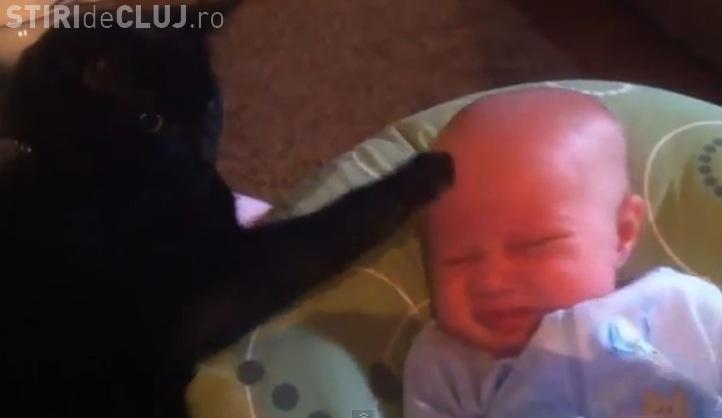 Un filmulet emotionant, in care o pisica mangaie pe cap un bebelus care plange, pana cand acesta adoarme, face senzatie pe Facebook si YouTube.
