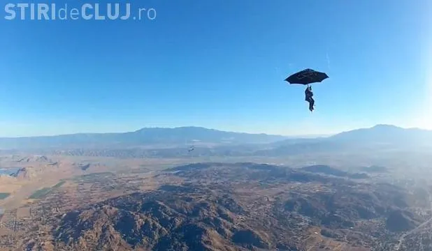 Zborul cu umbrela a început după ce Eric Roner a sărit din balonul cu aer cald în care se afla, dar nu a durat foarte mult, pentru că Roner a avut nevoie să deschidă paraşuta pentru a putea ateriza. Sincer, cred că nimeni nu ar vrea vrea să încerce o aterizare cu umbrela, oricât de mare şi solidă ar fi ea, scrie Descoperă.ro.