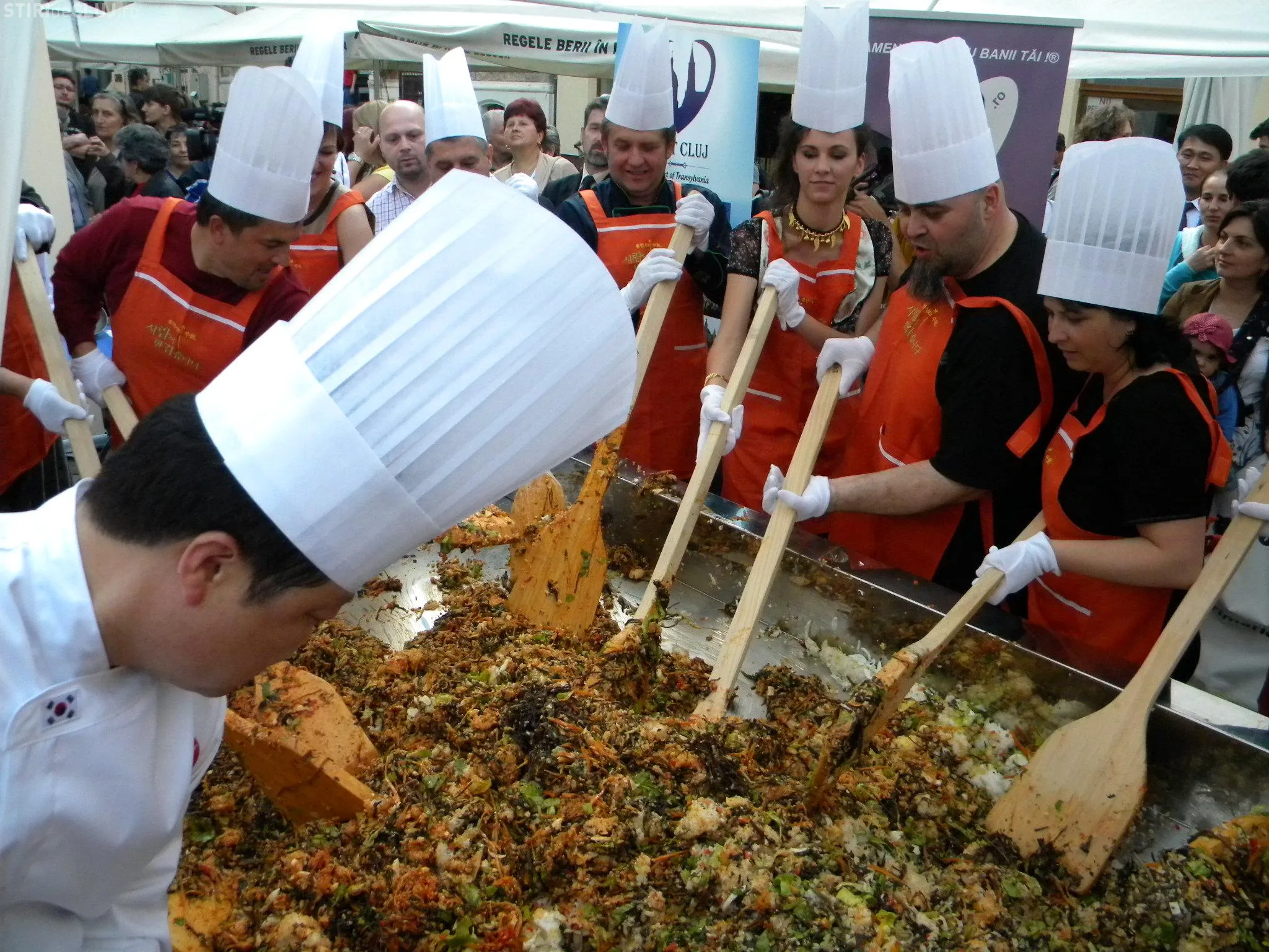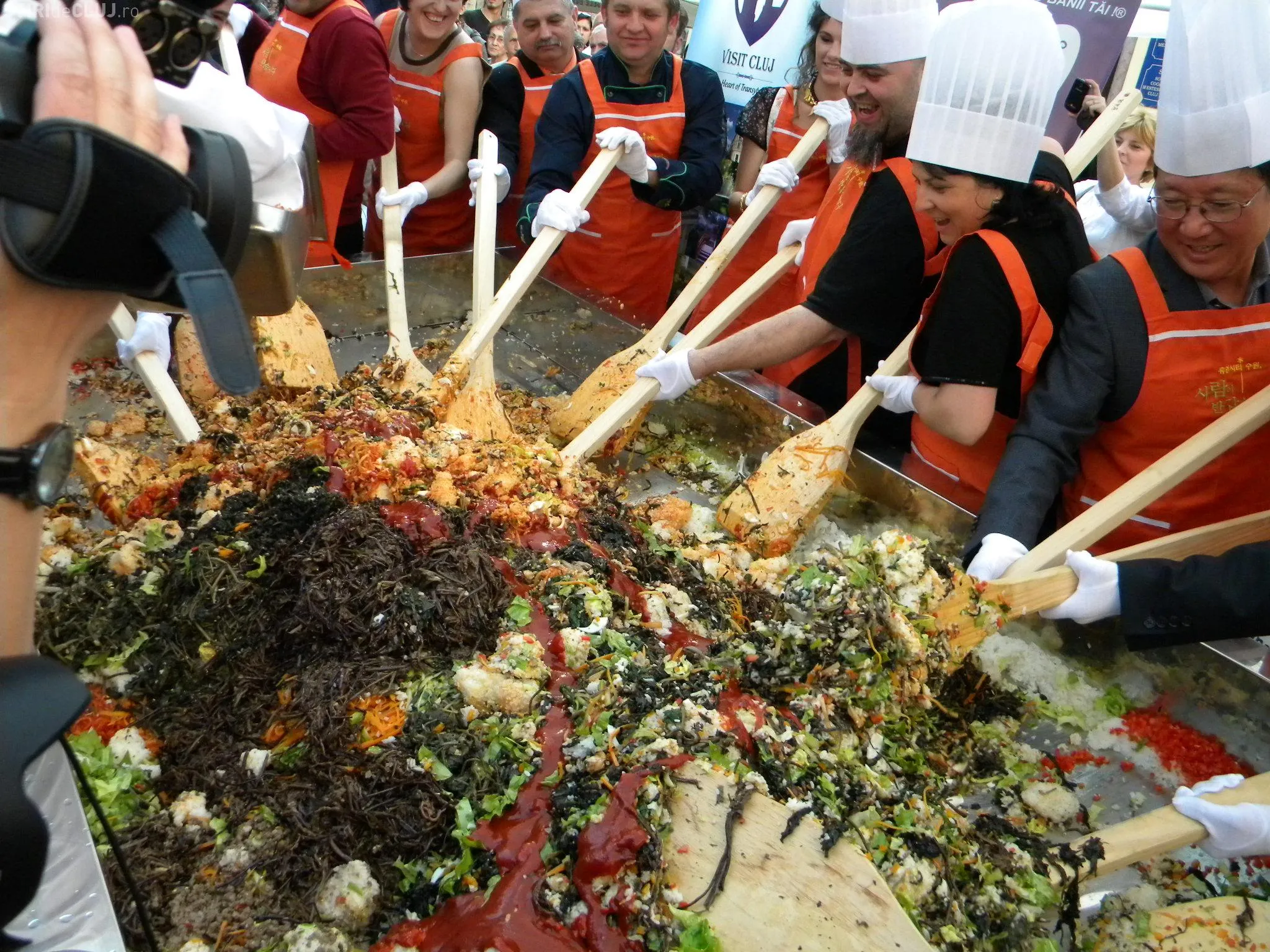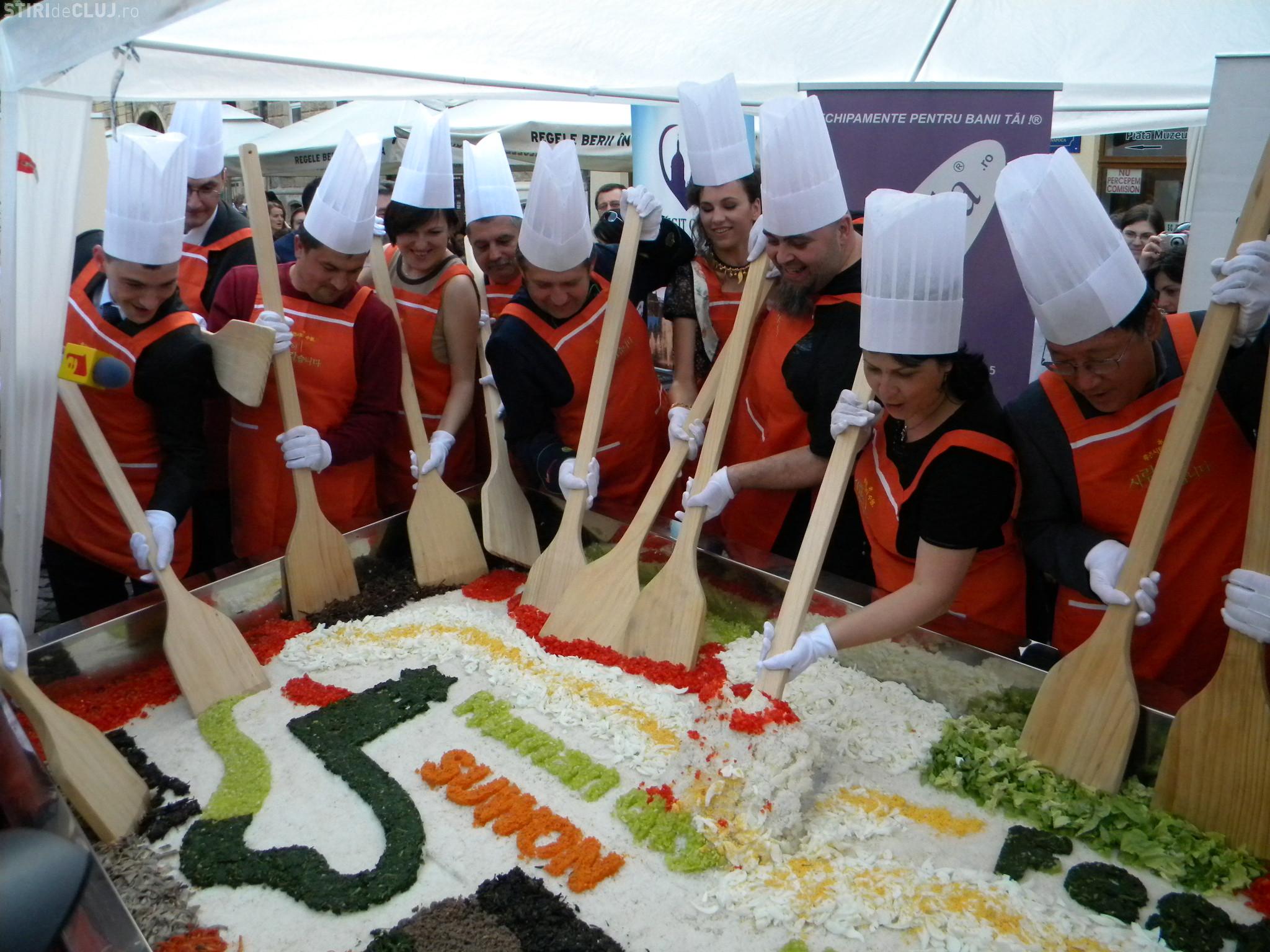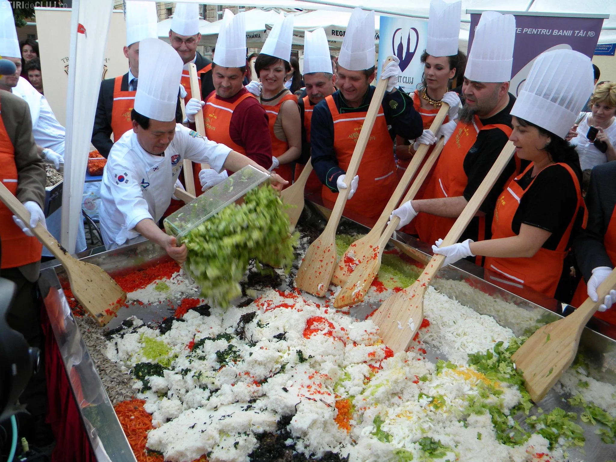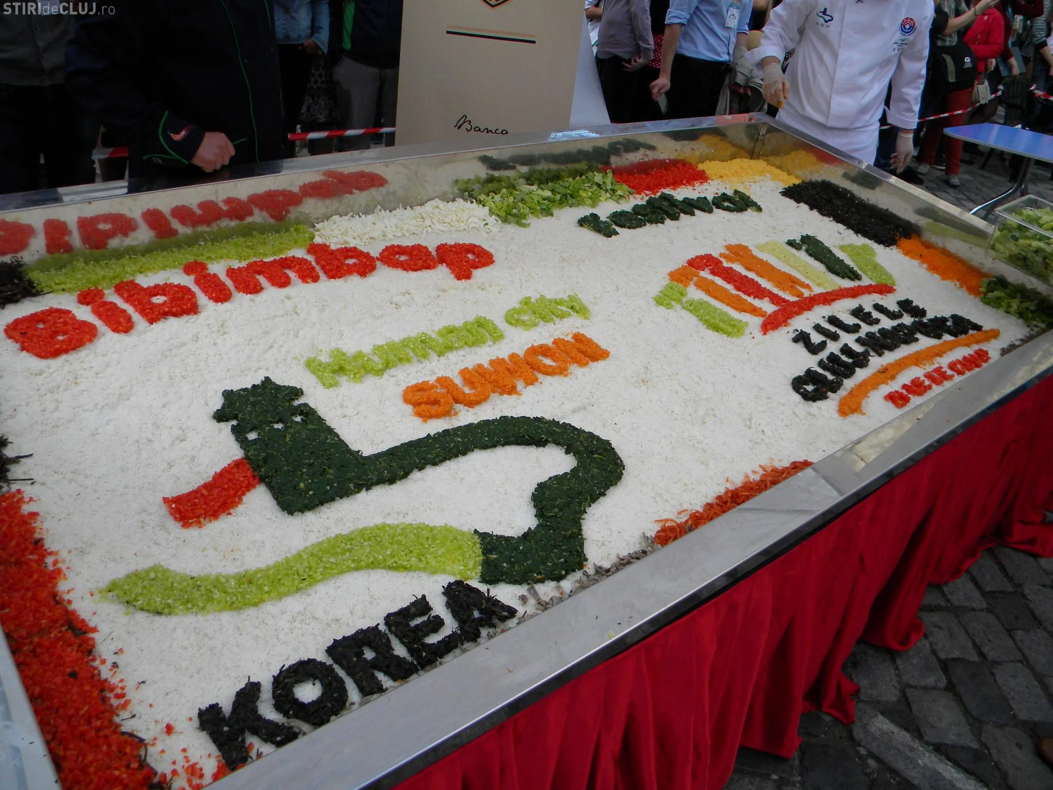 Initial, pe un "pat" de orez, bucatarii coreeni au scris cuvintele bibimbap si Zilele Clujului. "Acest fel se prepara in primul rand din orez, ingredientul de baza. Apoi sunt folosite ferigi de padure, ardei, ridichi, carne de vita in proportie foarte mica, spanac si oua. Toate acestea se amesteca si vor fi 10 vaslaci romani si 10 vaslasi coreeni si va iesi un produs spectaculos. Este in primele 5 produse din lume ca sanatate. In total a rezultat 40 de kilograme de produs finit", a explicat directorul Cantinei Primariei Cluj-Napoca, Gelu Visan.