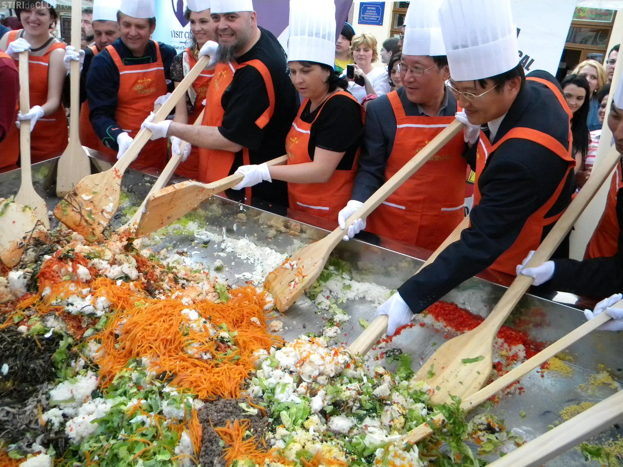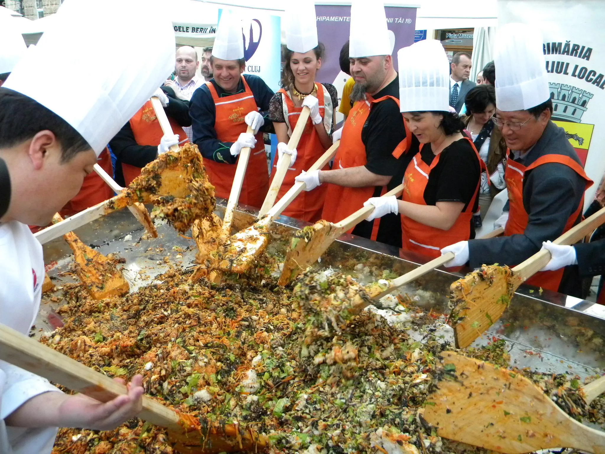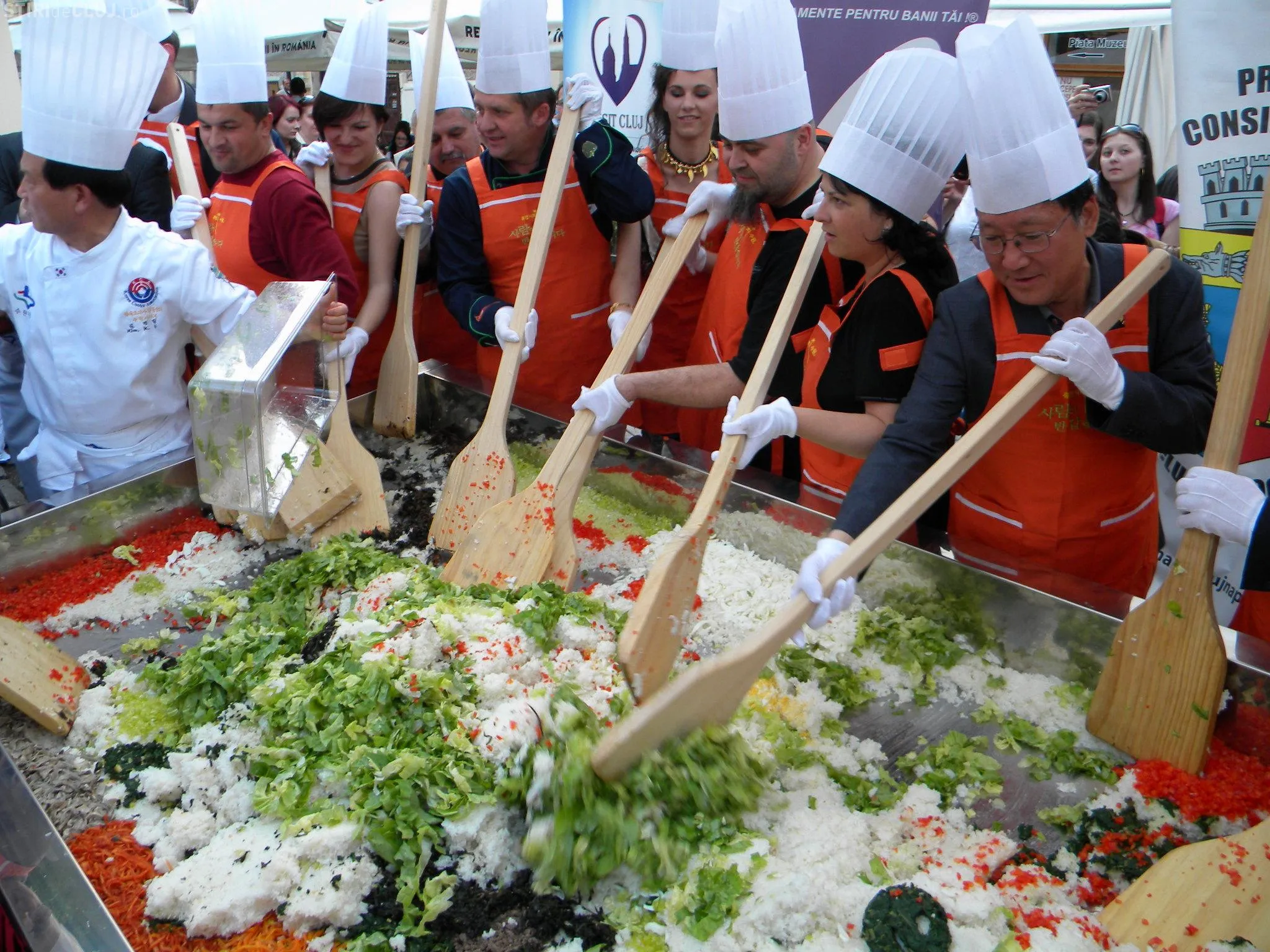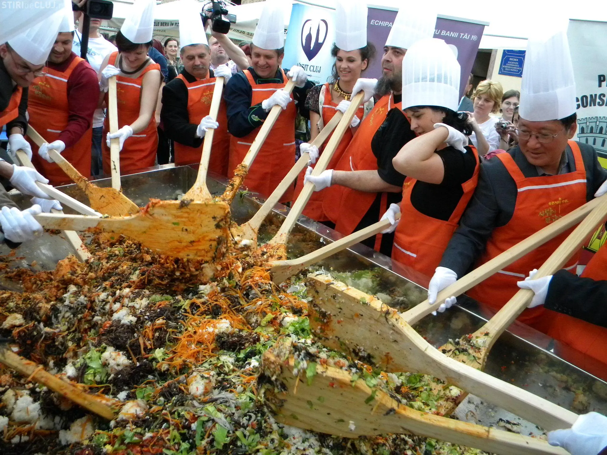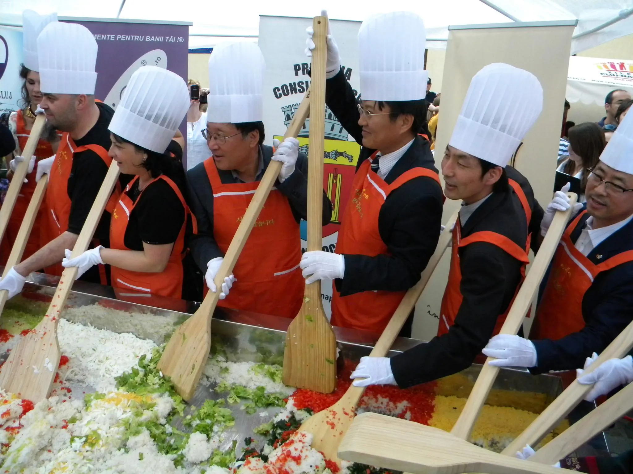 Initial, pe un "pat" de orez, bucatarii coreeni au scris cuvintele bibimbap si Zilele Clujului. "Acest fel se prepara in primul rand din orez, ingredientul de baza. Apoi sunt folosite ferigi de padure, ardei, ridichi, carne de vita in proportie foarte mica, spanac si oua. Toate acestea se amesteca si vor fi 10 vaslaci romani si 10 vaslasi coreeni si va iesi un produs spectaculos. Este in primele 5 produse din lume ca sanatate. In total a rezultat 40 de kilograme de produs finit", a explicat directorul Cantinei Primariei Cluj-Napoca, Gelu Visan.
