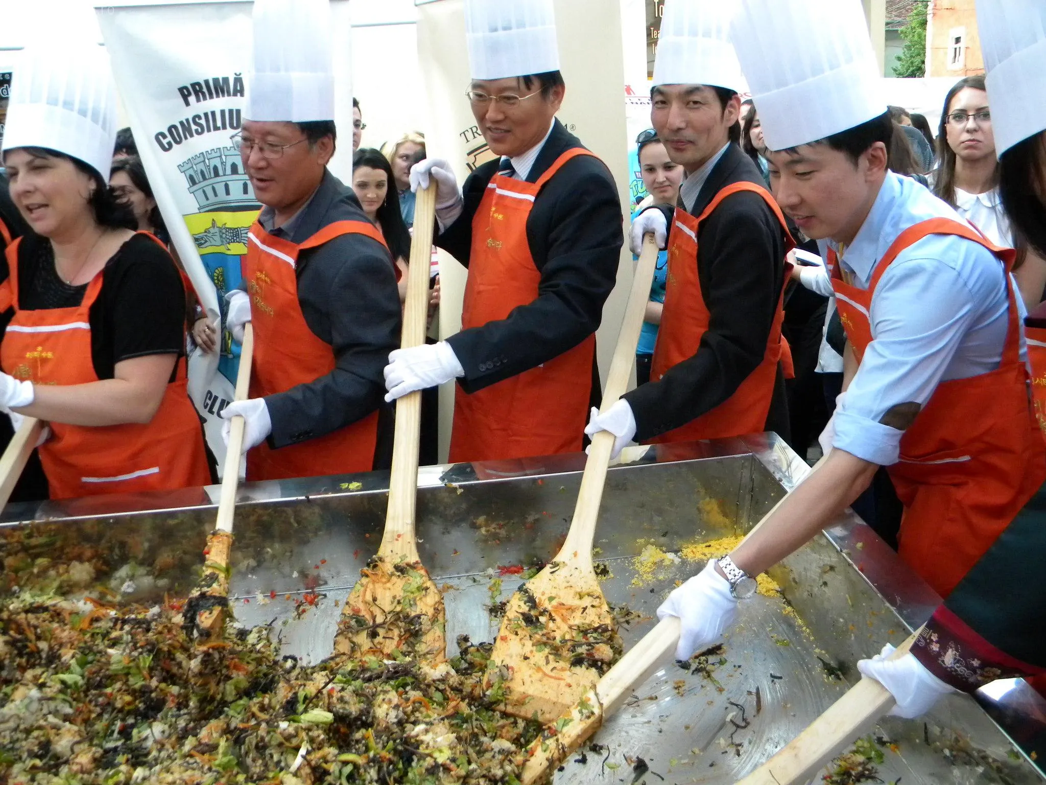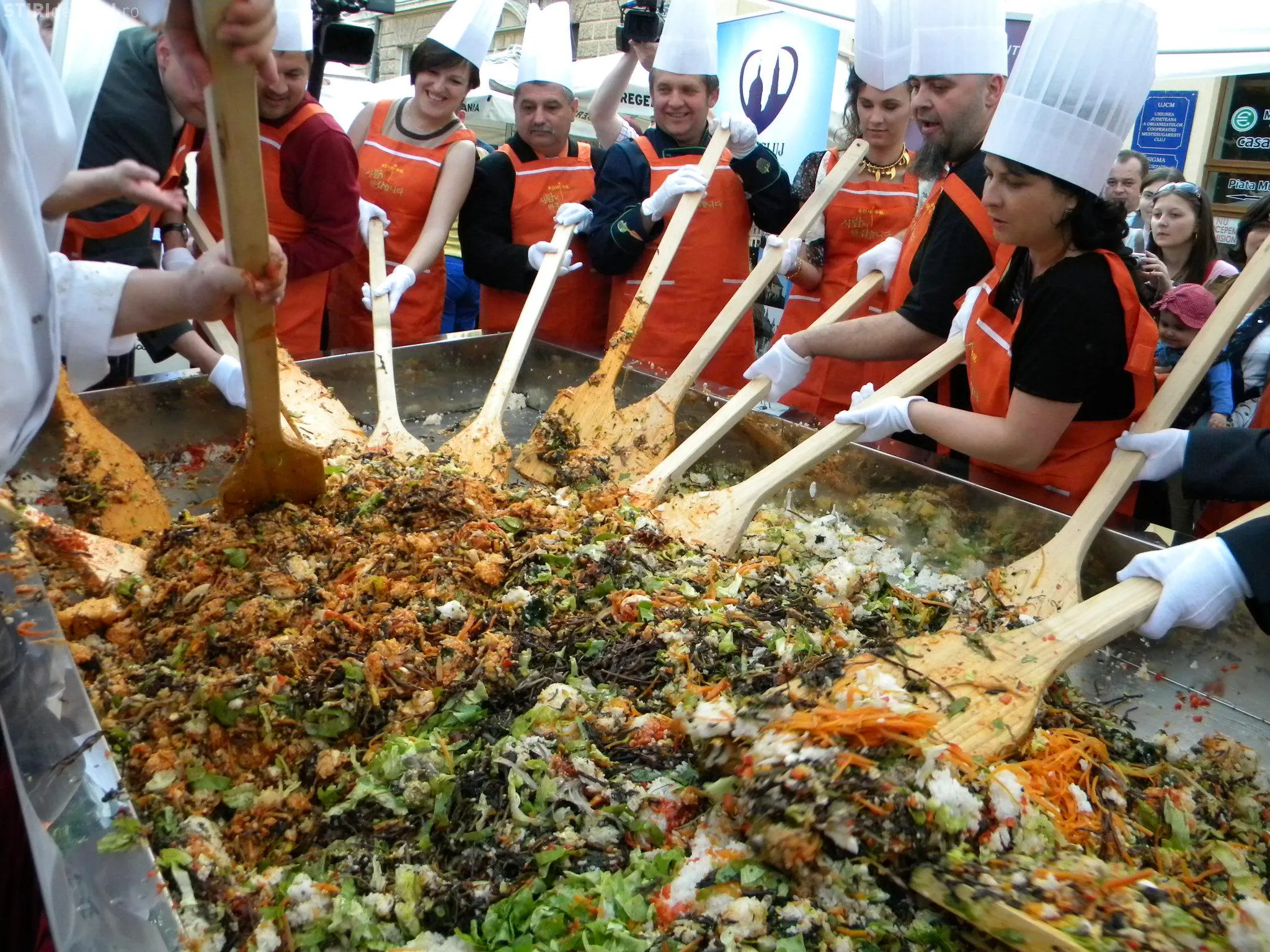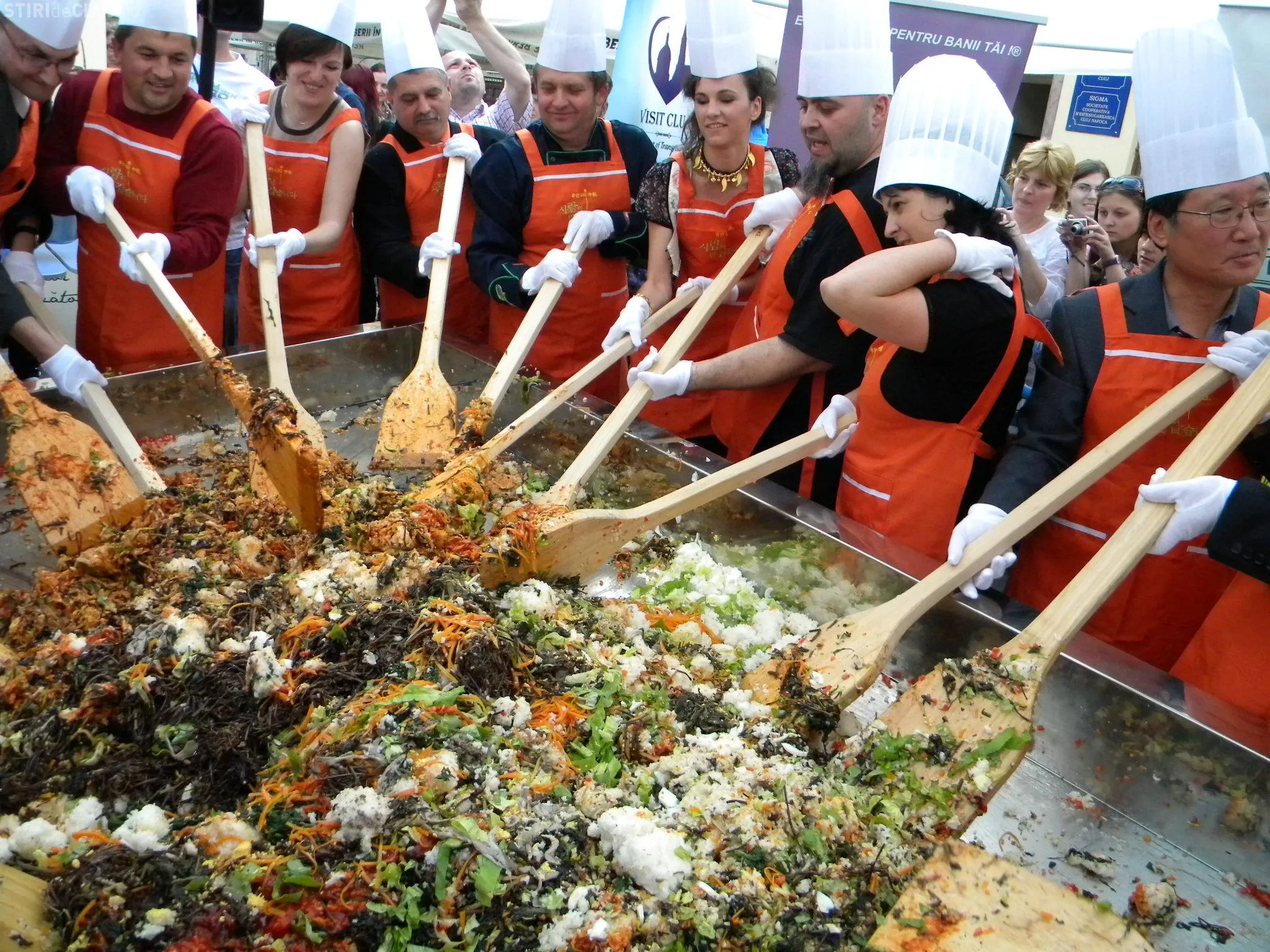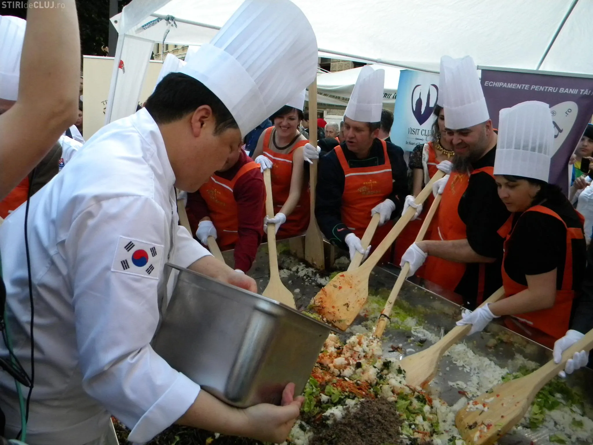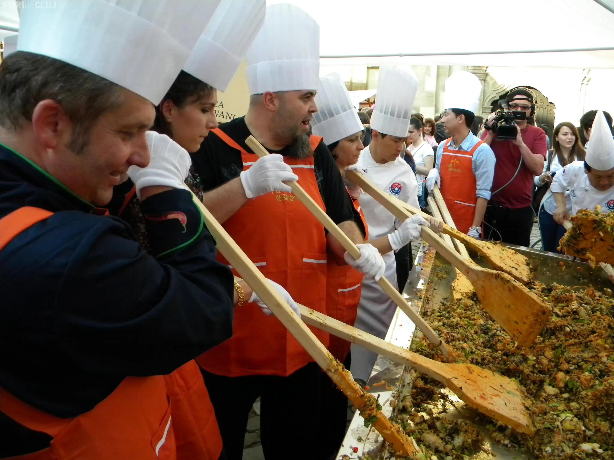 Initial, pe un "pat" de orez, bucatarii coreeni au scris cuvintele bibimbap si Zilele Clujului. "Acest fel se prepara in primul rand din orez, ingredientul de baza. Apoi sunt folosite ferigi de padure, ardei, ridichi, carne de vita in proportie foarte mica, spanac si oua. Toate acestea se amesteca si vor fi 10 vaslaci romani si 10 vaslasi coreeni si va iesi un produs spectaculos. Este in primele 5 produse din lume ca sanatate. In total a rezultat 40 de kilograme de produs finit", a explicat directorul Cantinei Primariei Cluj-Napoca, Gelu Visan.
