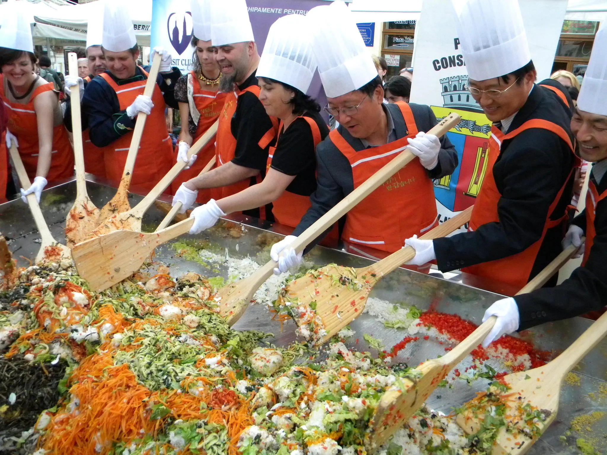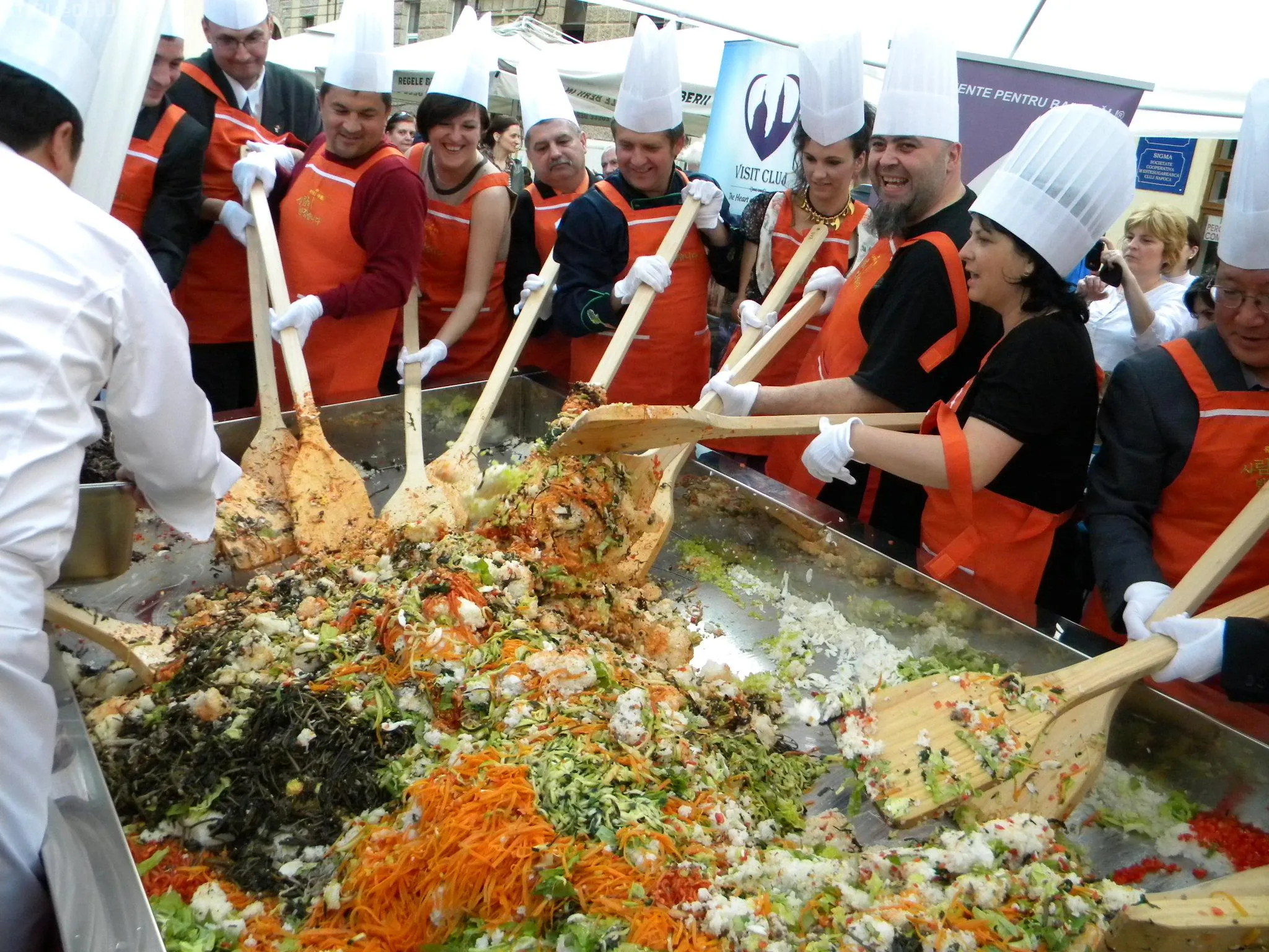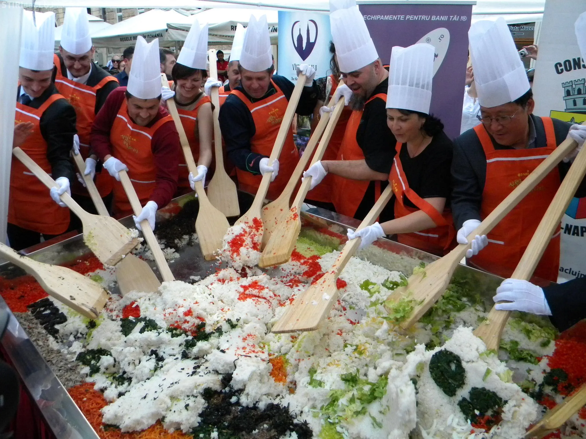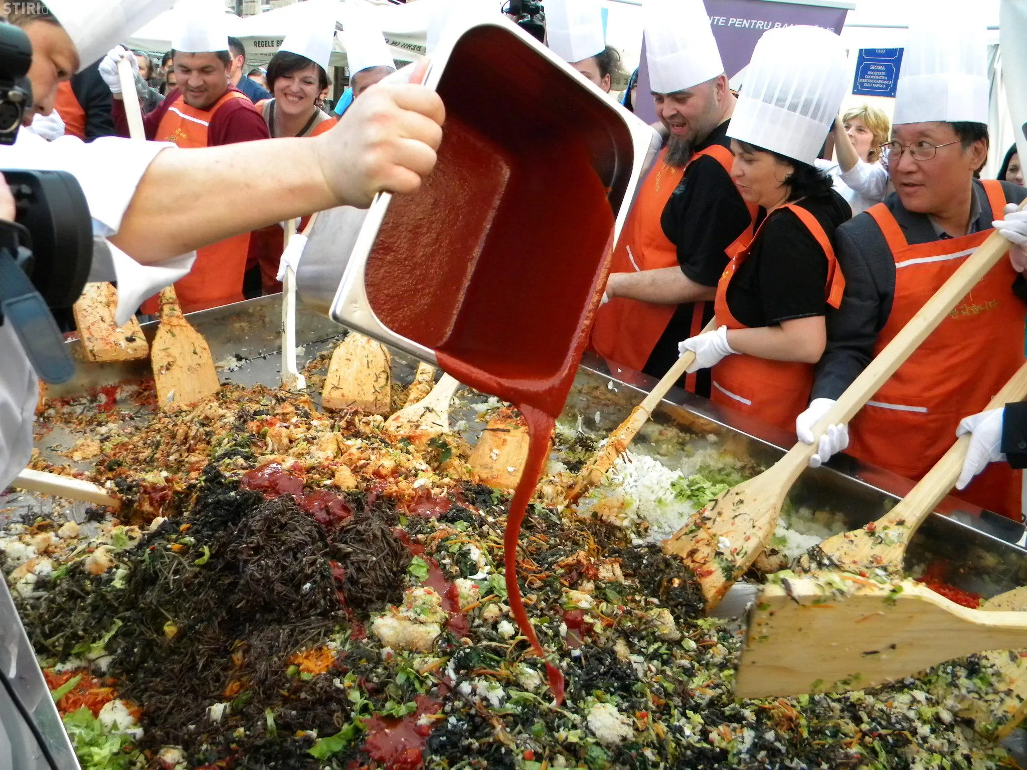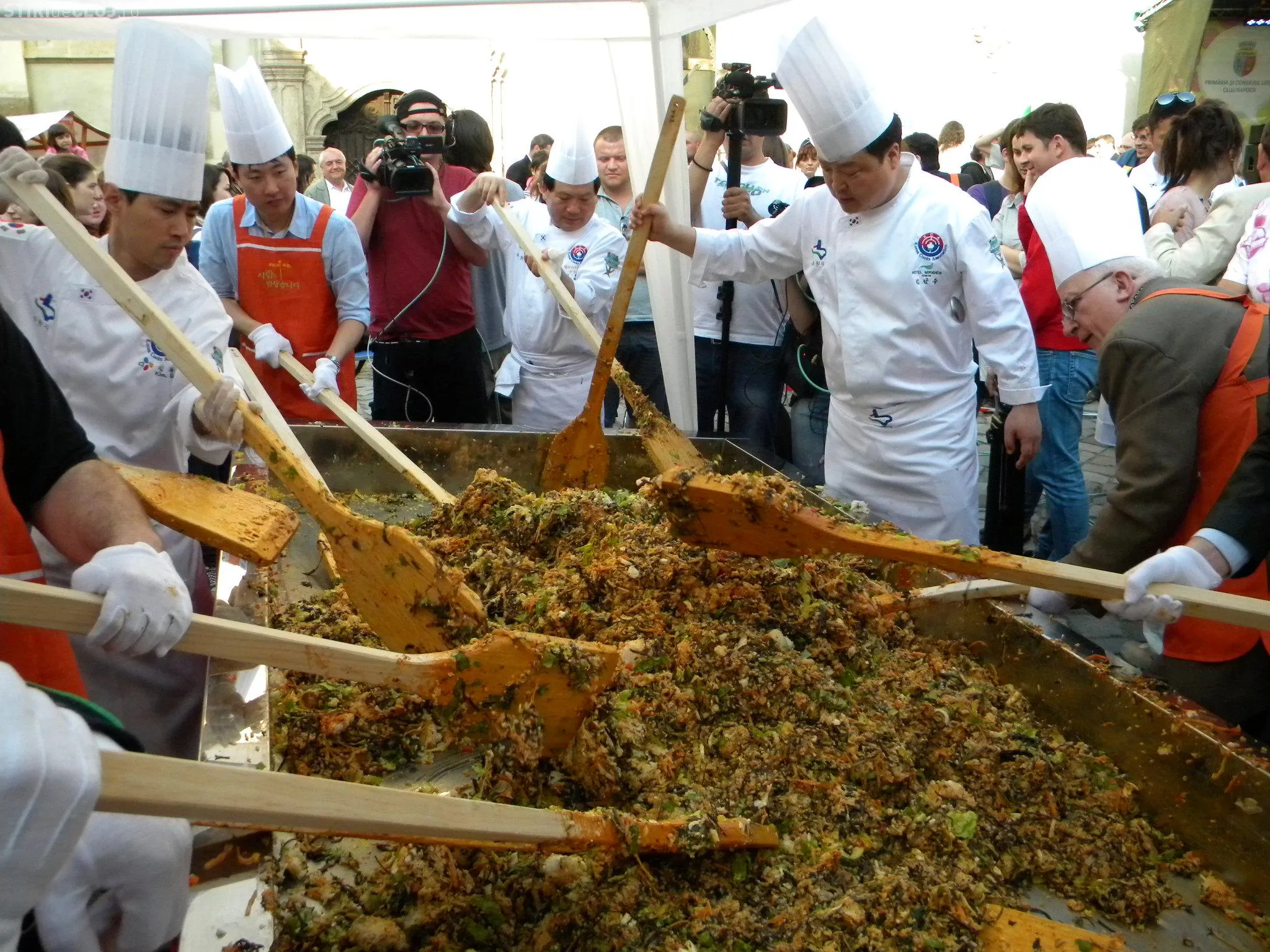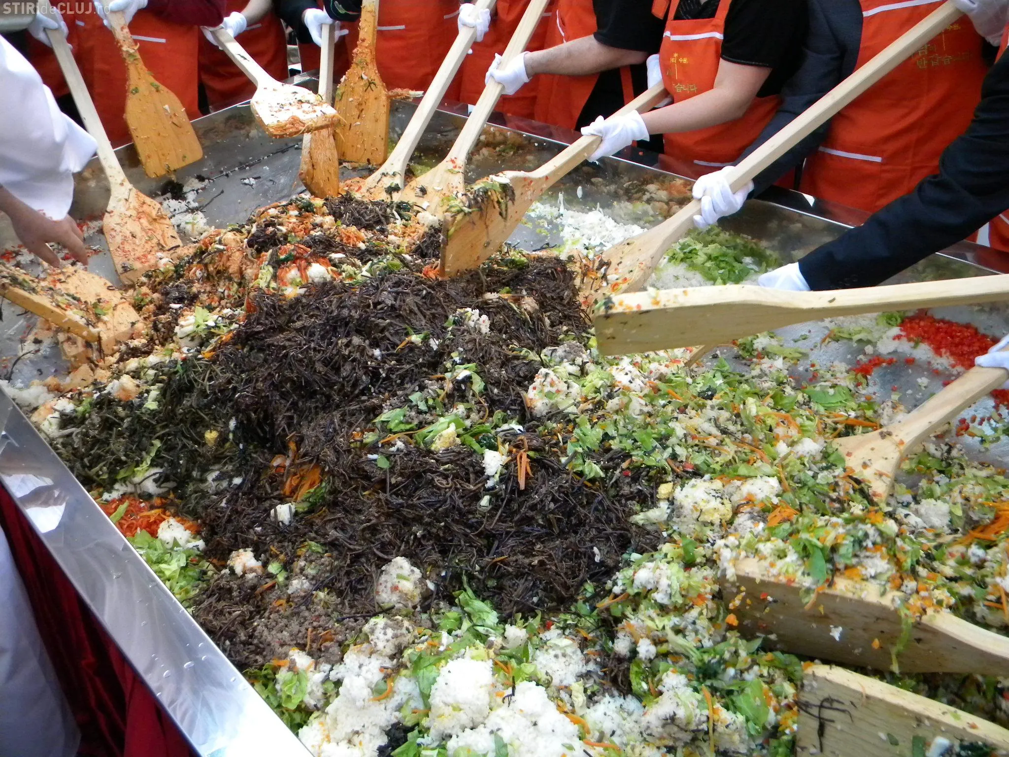 Initial, pe un "pat" de orez, bucatarii coreeni au scris cuvintele bibimbap si Zilele Clujului. "Acest fel se prepara in primul rand din orez, ingredientul de baza. Apoi sunt folosite ferigi de padure, ardei, ridichi, carne de vita in proportie foarte mica, spanac si oua. Toate acestea se amesteca si vor fi 10 vaslaci romani si 10 vaslasi coreeni si va iesi un produs spectaculos. Este in primele 5 produse din lume ca sanatate. In total a rezultat 40 de kilograme de produs finit", a explicat directorul Cantinei Primariei Cluj-Napoca, Gelu Visan.