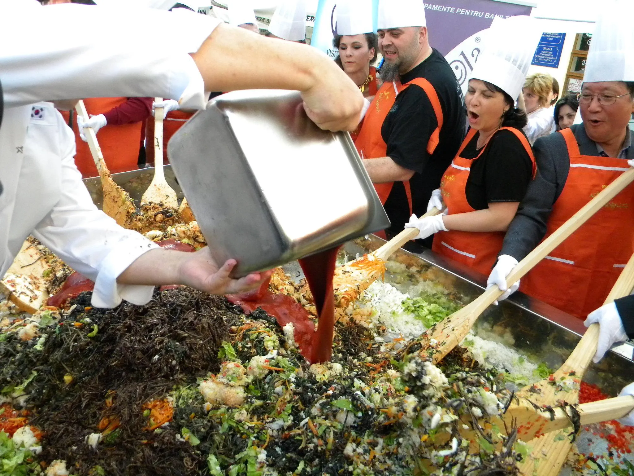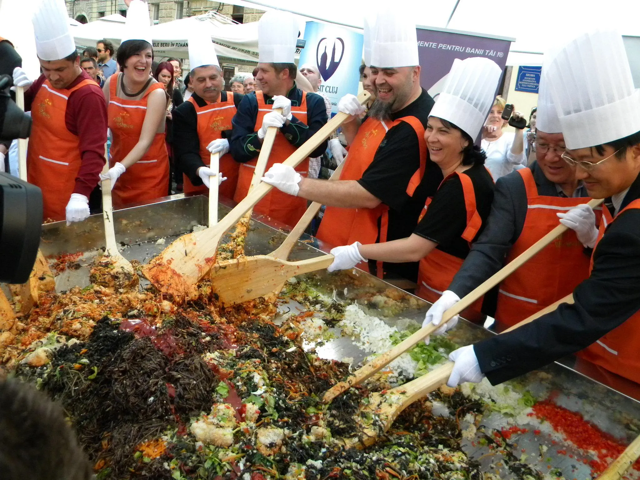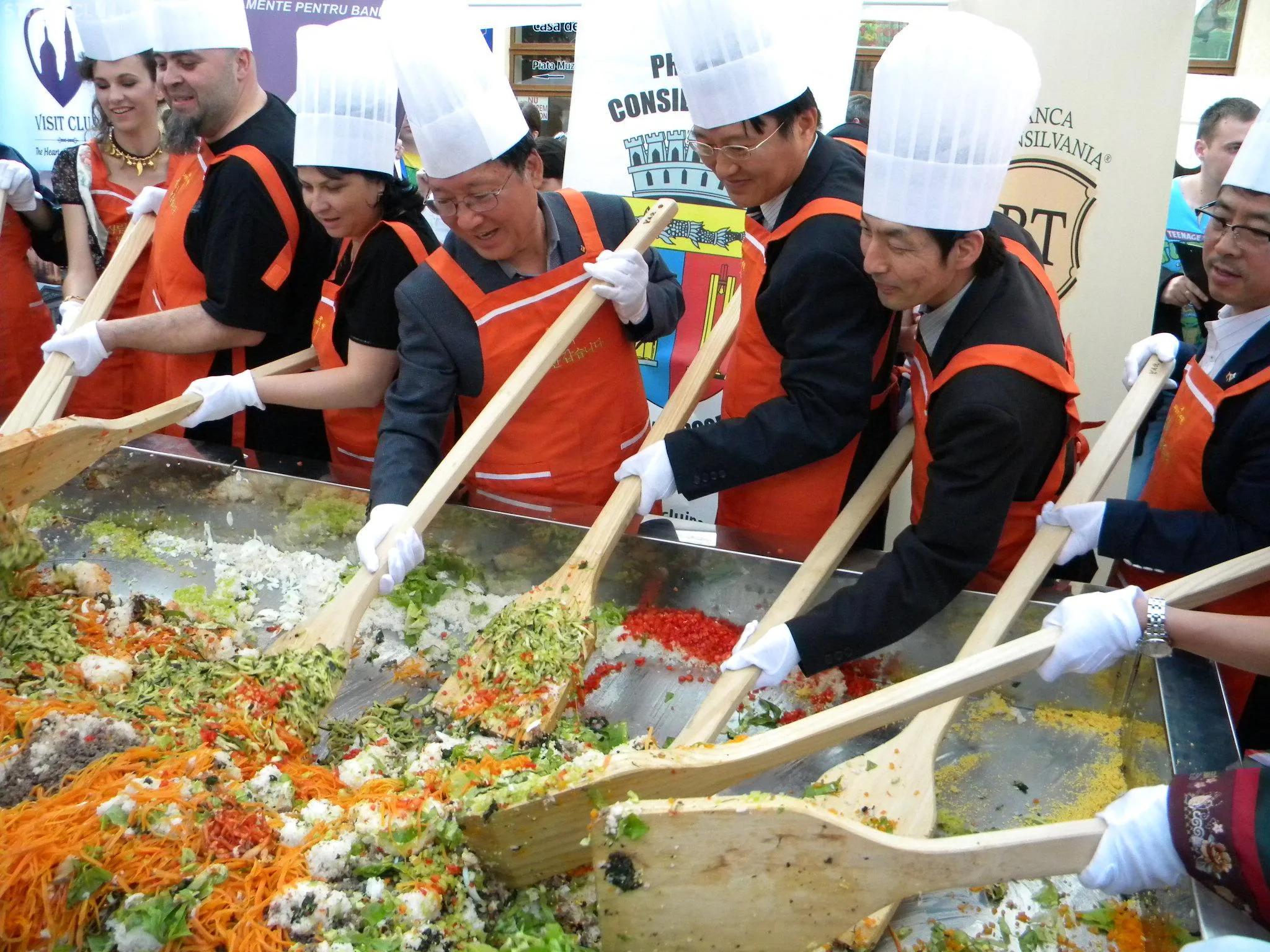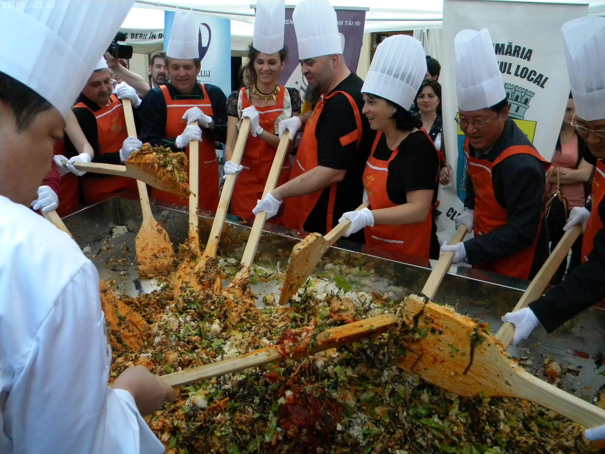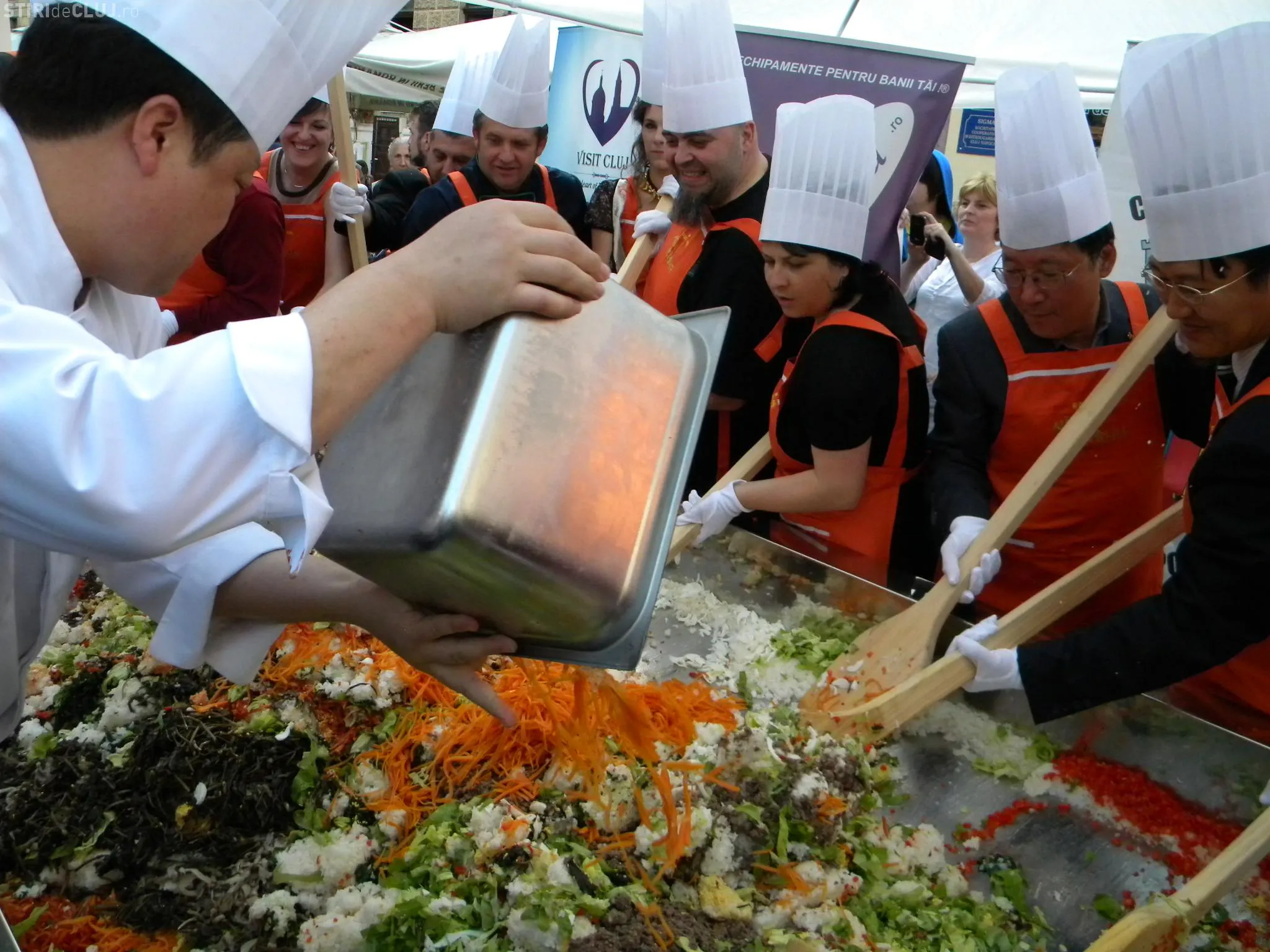 Initial, pe un "pat" de orez, bucatarii coreeni au scris cuvintele bibimbap si Zilele Clujului. "Acest fel se prepara in primul rand din orez, ingredientul de baza. Apoi sunt folosite ferigi de padure, ardei, ridichi, carne de vita in proportie foarte mica, spanac si oua. Toate acestea se amesteca si vor fi 10 vaslaci romani si 10 vaslasi coreeni si va iesi un produs spectaculos. Este in primele 5 produse din lume ca sanatate. In total a rezultat 40 de kilograme de produs finit", a explicat directorul Cantinei Primariei Cluj-Napoca, Gelu Visan.