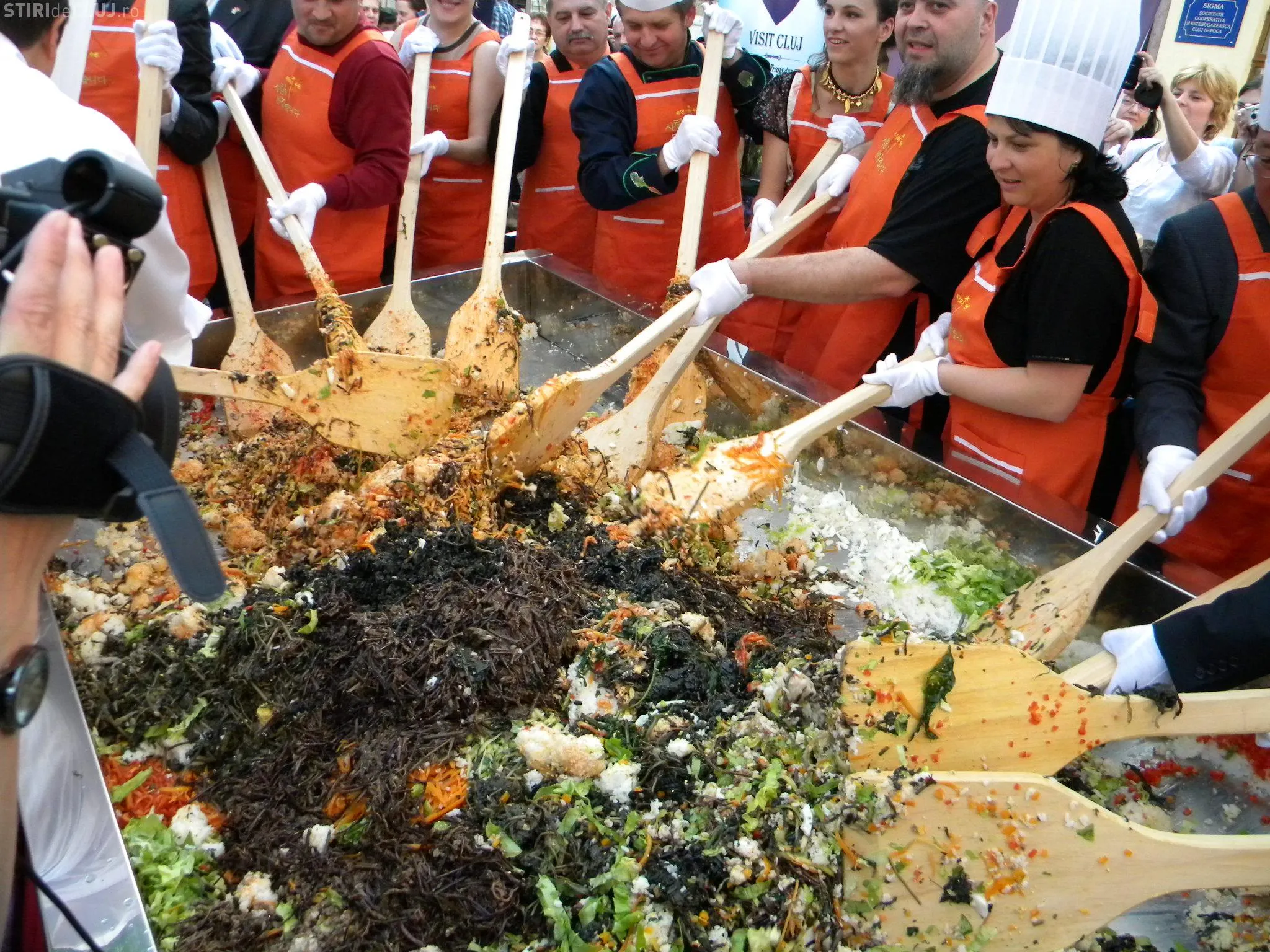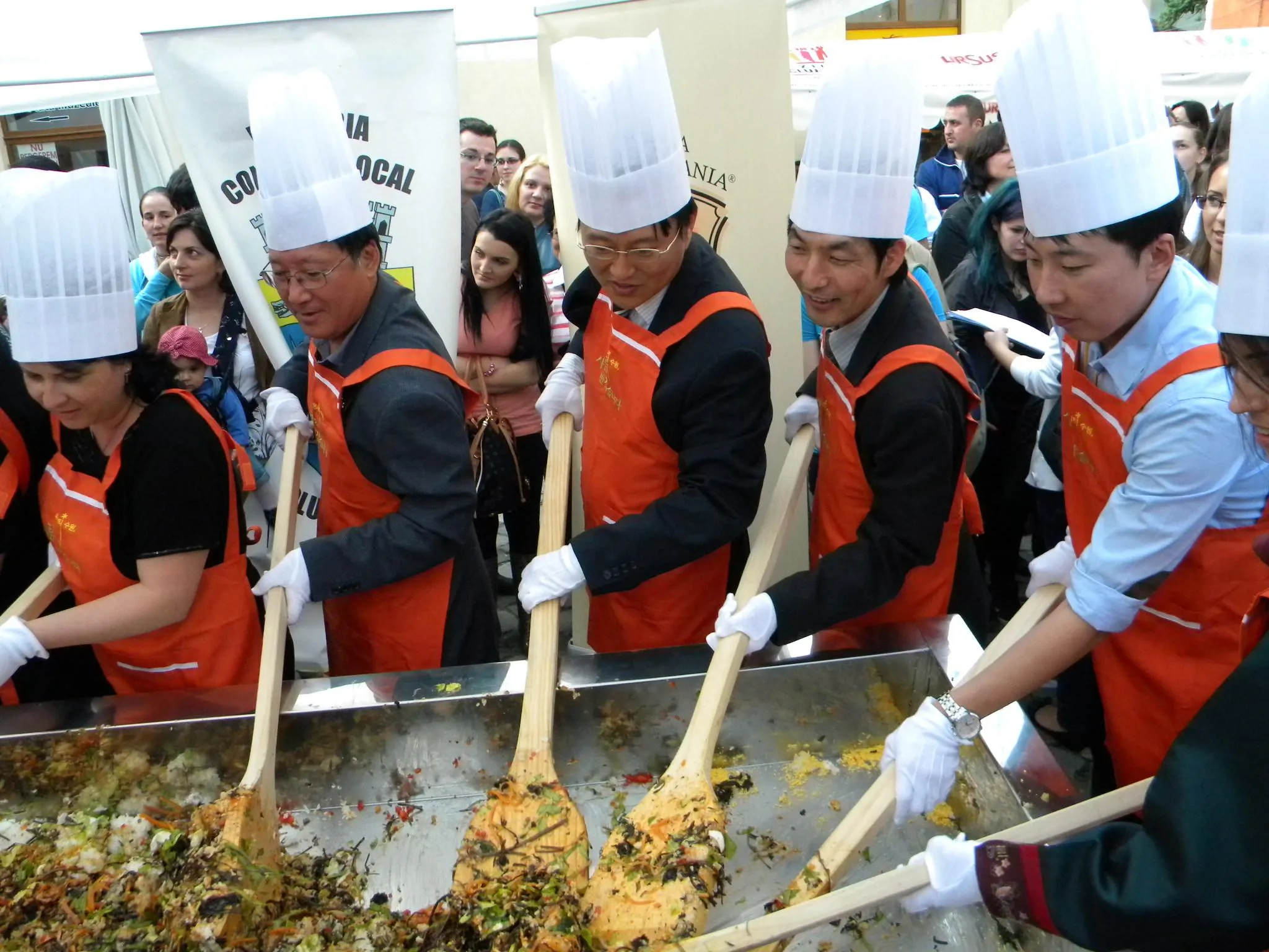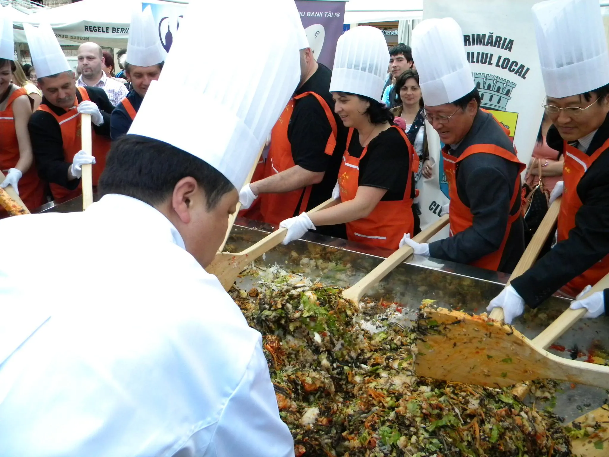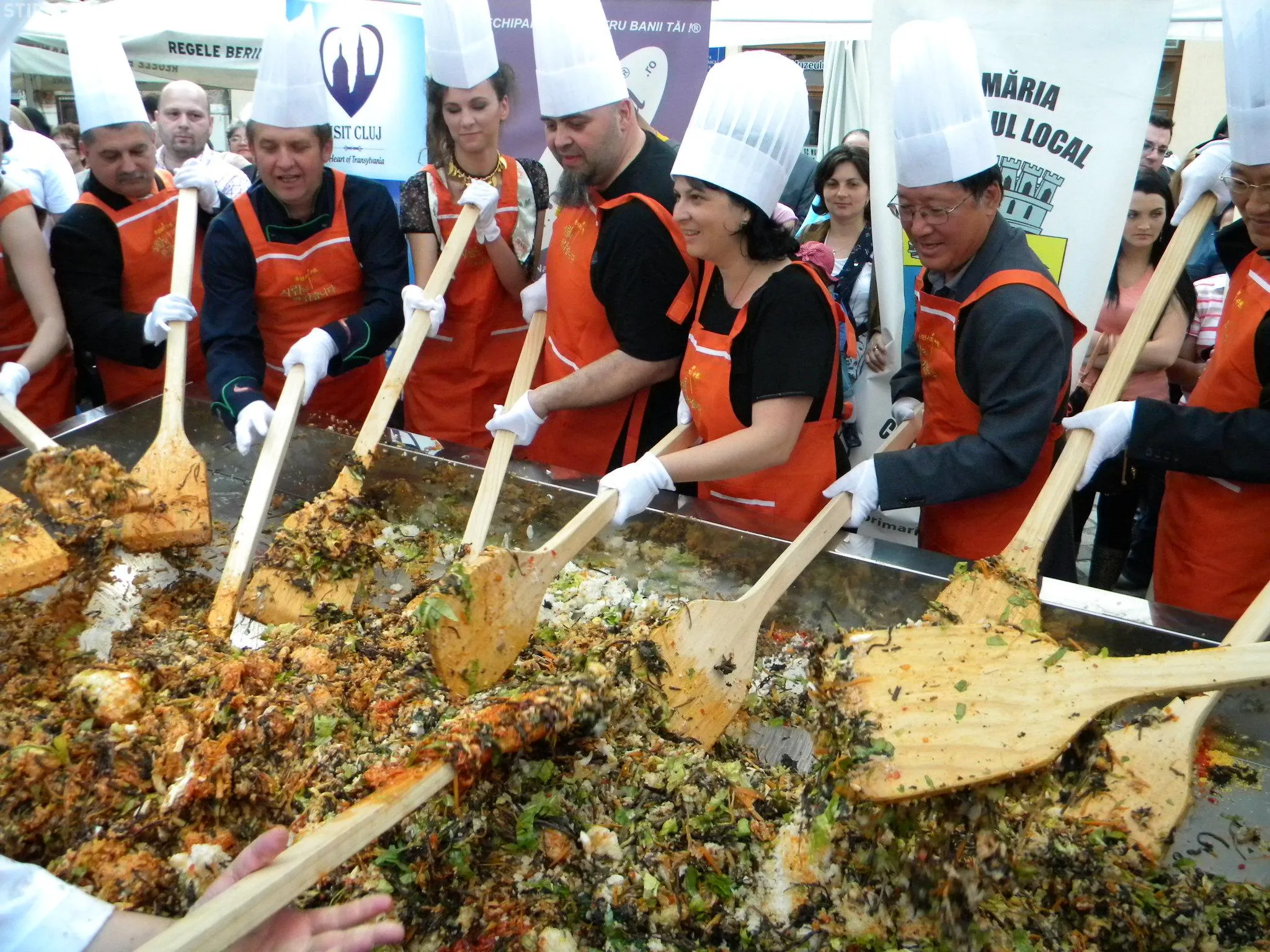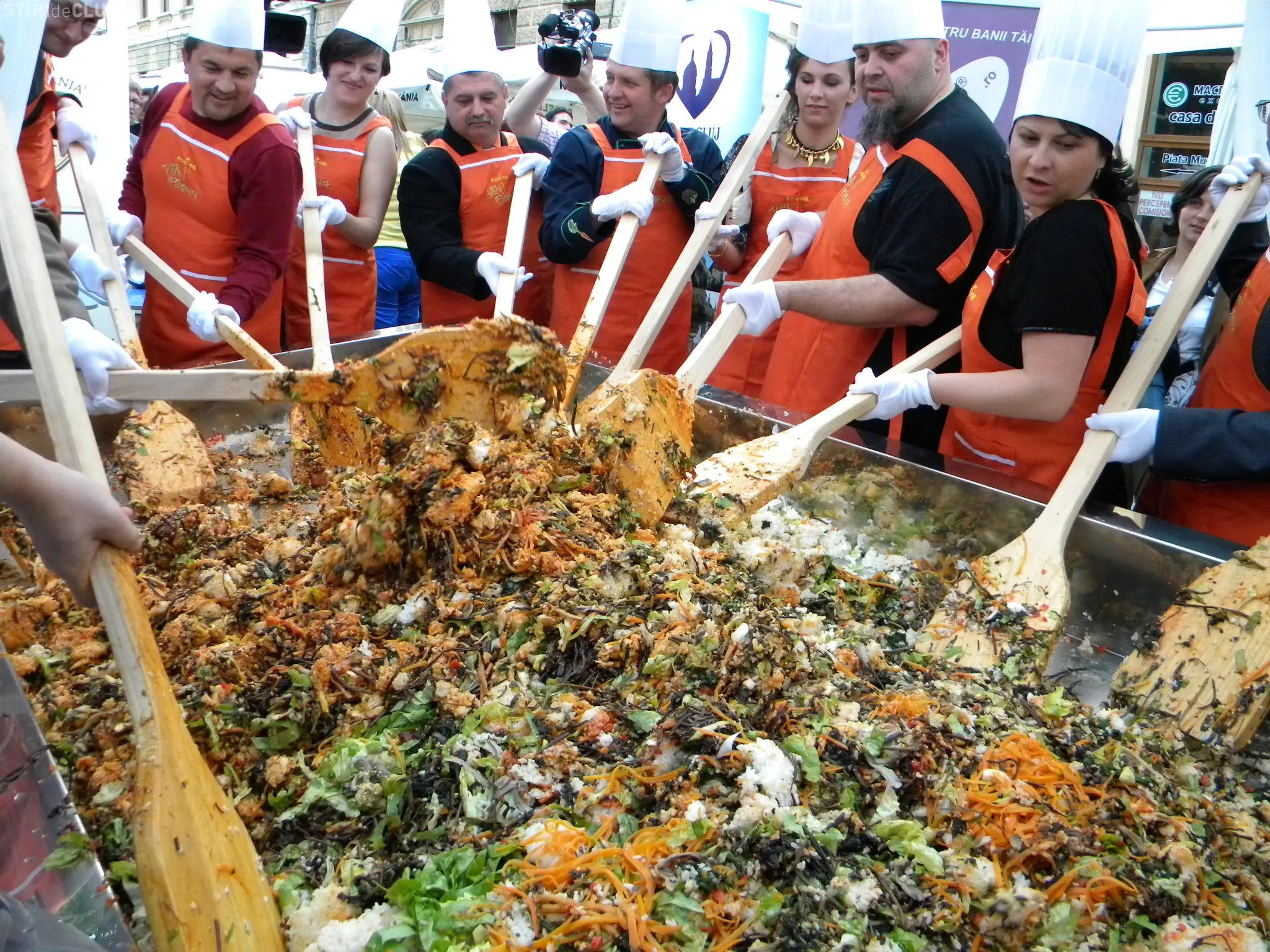 Initial, pe un "pat" de orez, bucatarii coreeni au scris cuvintele bibimbap si Zilele Clujului. "Acest fel se prepara in primul rand din orez, ingredientul de baza. Apoi sunt folosite ferigi de padure, ardei, ridichi, carne de vita in proportie foarte mica, spanac si oua. Toate acestea se amesteca si vor fi 10 vaslaci romani si 10 vaslasi coreeni si va iesi un produs spectaculos. Este in primele 5 produse din lume ca sanatate. In total a rezultat 40 de kilograme de produs finit", a explicat directorul Cantinei Primariei Cluj-Napoca, Gelu Visan.