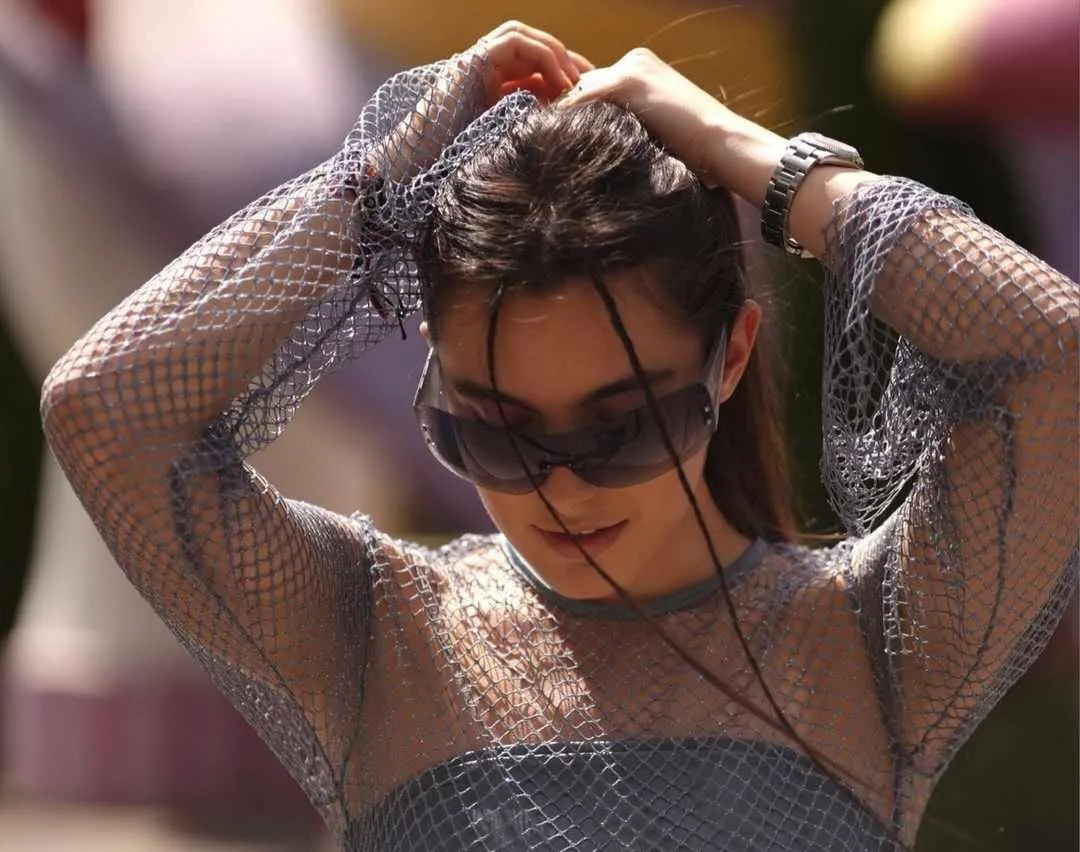 În primă fază, frumoasa brunetă a ales o pereche de blugi și o bustieră în aceeași nuanță, lăsând la vedere un abdomen frumos lucrat. A etalat apoi o pereche de blugi, scurți și o bluză plasă gri, dublată în zona sânilor.