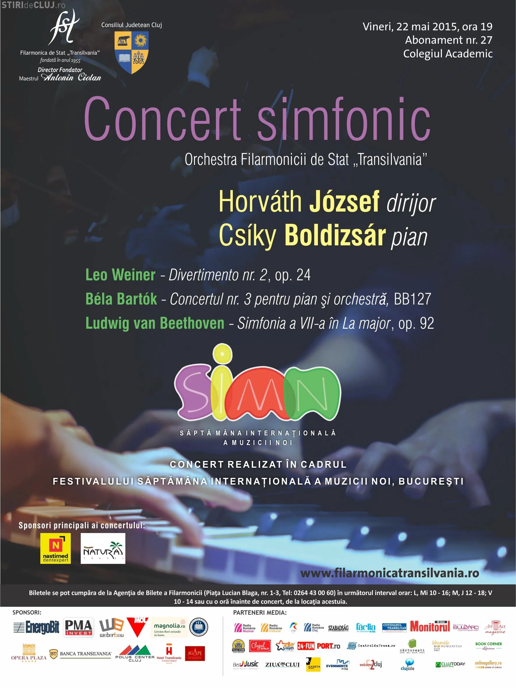 Pe scena Colegiului Academic va urca și pianistul Csíky Boldizsár, pentru a interpreta - Concertul nr. 3 pentru pian şi orchestră, de Béla Bartók . Din program fac parte și lucrări ale compozitorilor Ludwig van Beethoven și Leo Weiner.