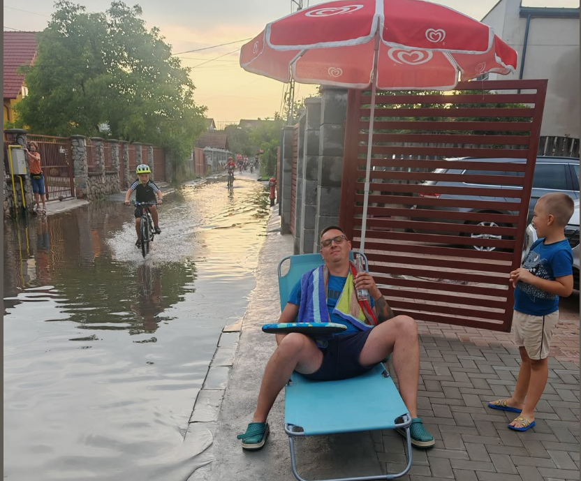Cu o umbrelă lângă și șezlongul instalat chiar pe „nisipul” ud (adică asfaltul acoperit de apă), floreșteanul a fost pregăt pentru un adevărat sejur all inclusive… la doi pași de casă. În timp ce alți locuitori din Florești se plâng de inundațiile din zonă, unii au descoperit partea amuzantă a situației, transformând ploaia într-o oportunitate de vacanță neconvențională, cu „valuri” chiar pe stradă și un apus de neuitat pe fundal.
