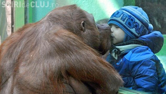 Un baietel, impresionat de urangutanul din cusca, si-a lipit buzele de geam, iar animalul l-a imitat.
