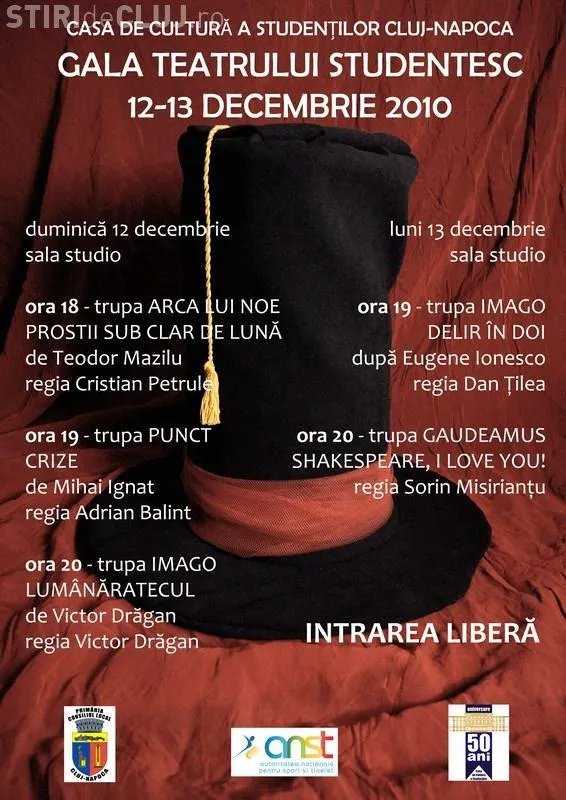 Gala Teatrului Studentesc se desfasoara la Cluj Napoca, in perioada 12 - 13 decembrie, la Casa de Cultura a Studentilor.
