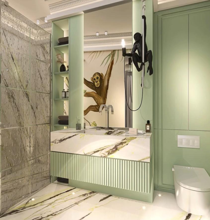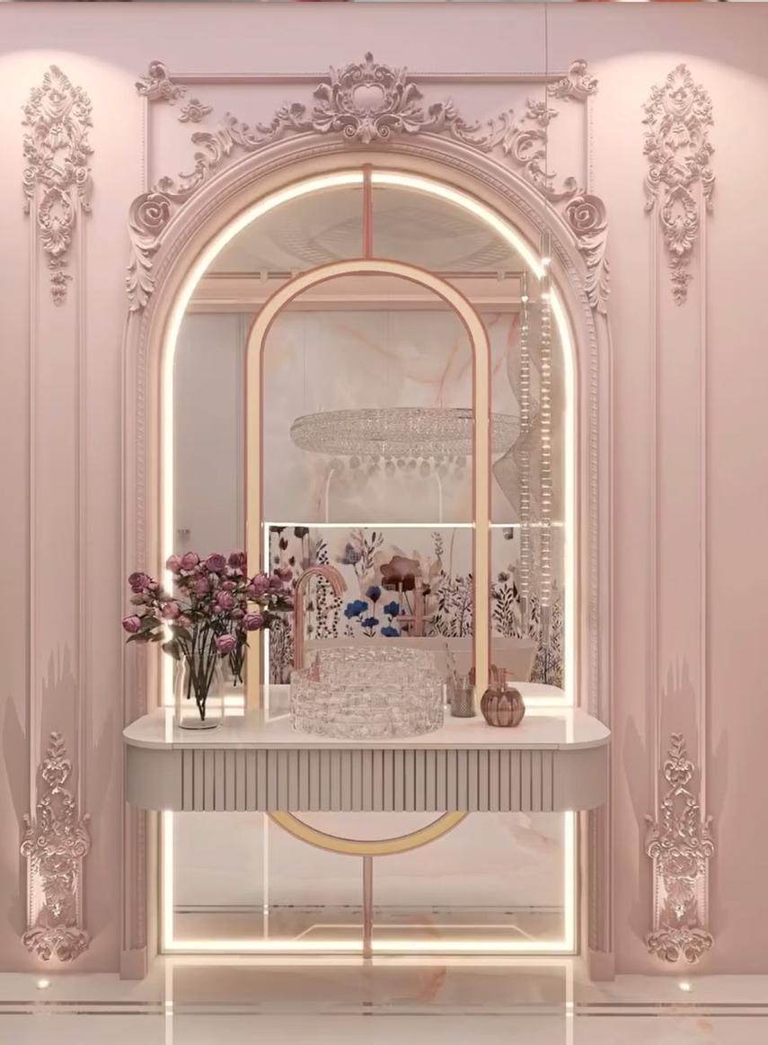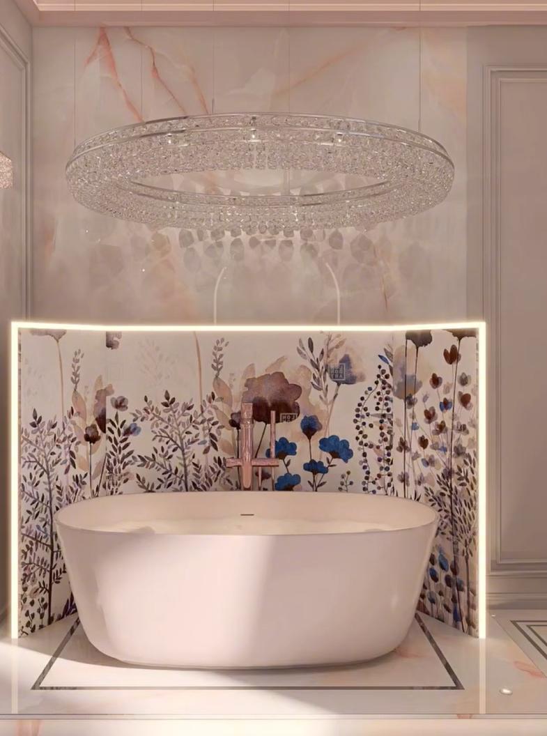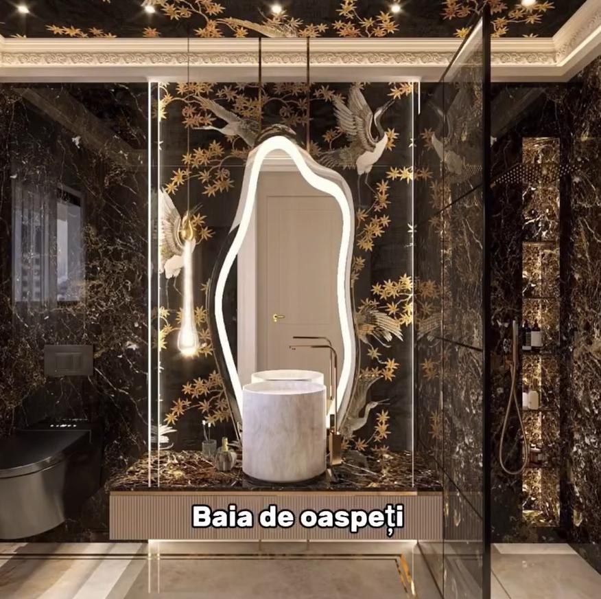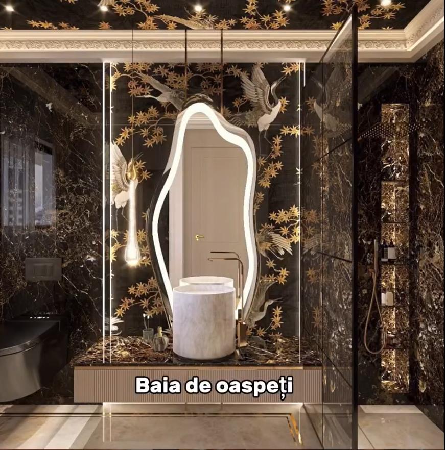 Baia fetiței este un adevărat spectacol, cu un candelabru de cristal impresionant și o cadă ovală elegantă, înconjurată de tapet floral și iluminată discret cu LED-uri. Fetița are, de asemenea, un dressing propriu, unde își poate depozita hainele într-un spațiu dedicat.