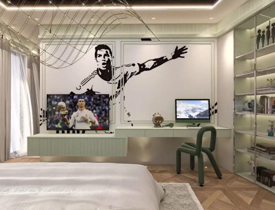 Fiul lor ce cerut și el un decor special cu celebrul fotbalist Cristiano Ronaldo, iar pe peretele din spatele televizorului se va afla un sticker uriaș cu chipul acestuia. În plus, băiatul beneficiază de o baie spectaculoasă în nuanțe de verde și cu un sticker cu o maimuță pe perete, îndeplinind astfel visul copilului.