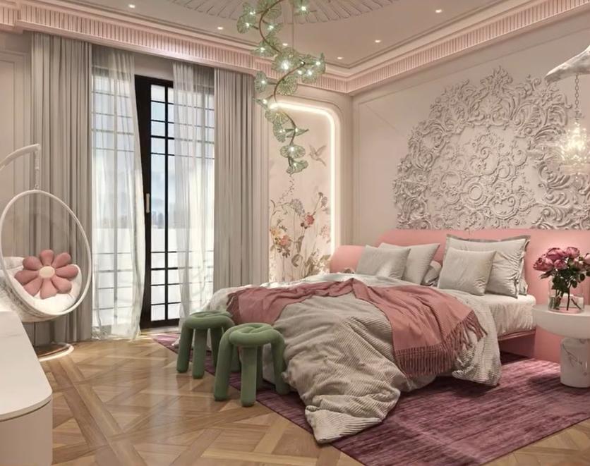 În ceea ce privește camerele copiilor, fiecare detaliu a fost gândit cu mare atenție. Pentru fetița lor, designerul a creat un decor de basm, cu un pat mare de prințesă, îmbrăcat în nuanțe de roz, și o atmosferă de vis, accentuată de un fotoliu balansoar suspendat și o măsuță cu flori.