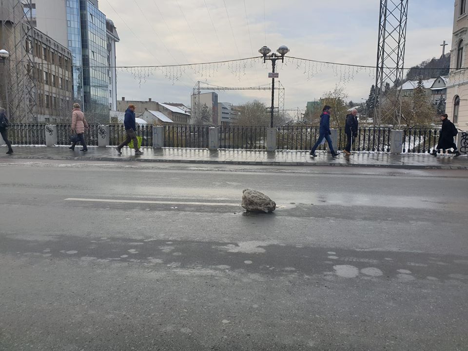 Probabil ”ghețarul” a căzut de pe un utilaj de mare tonaj care lucrează pe strada Regele Ferdinand.