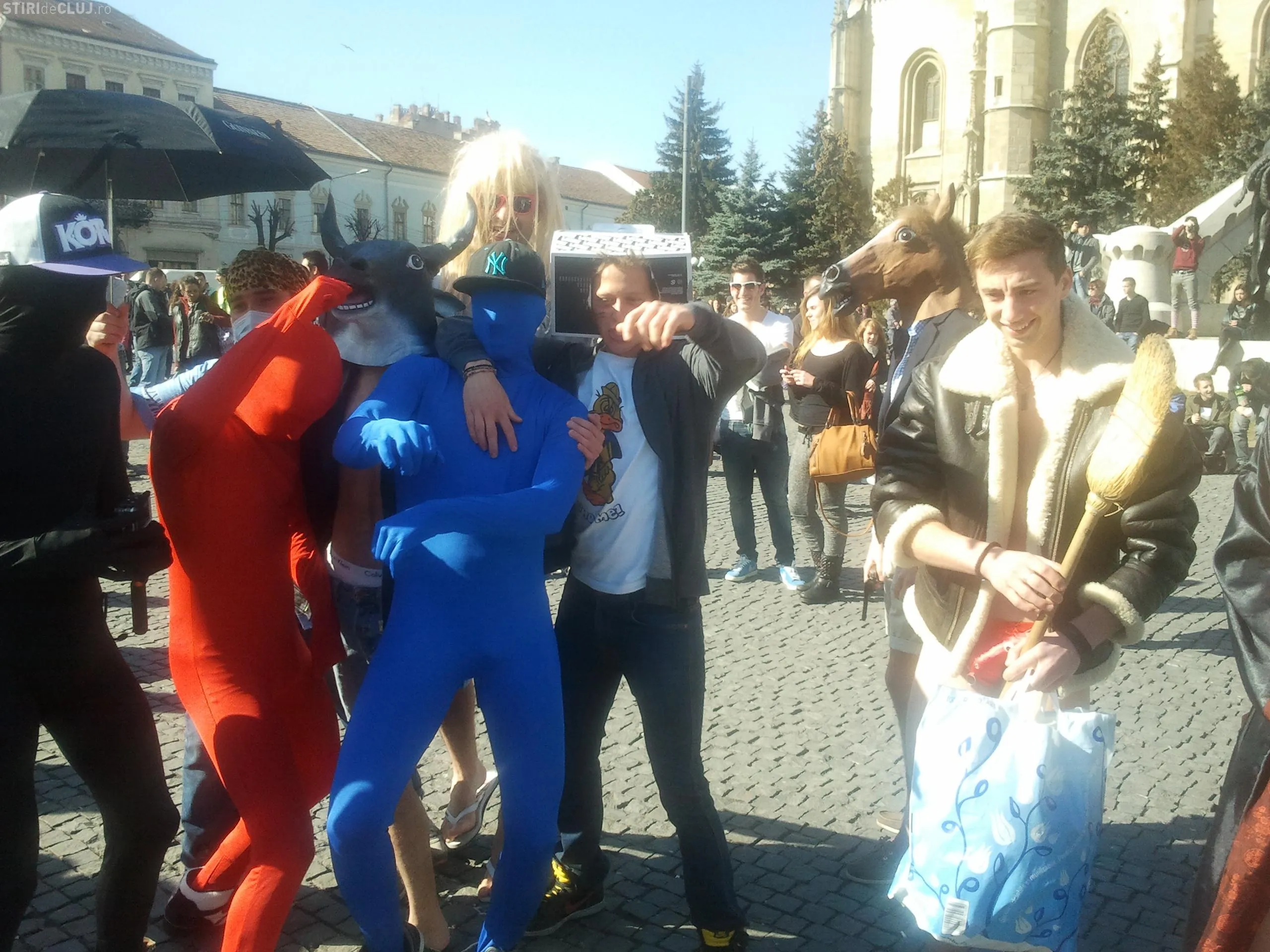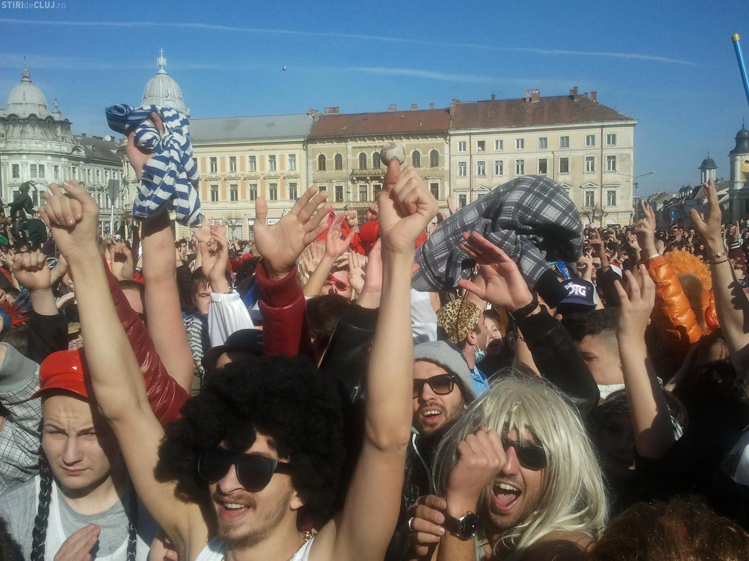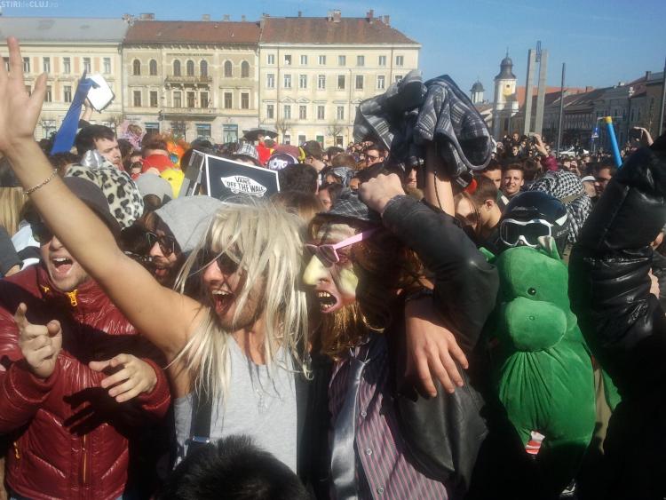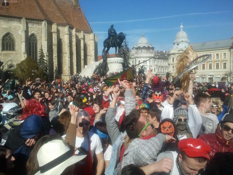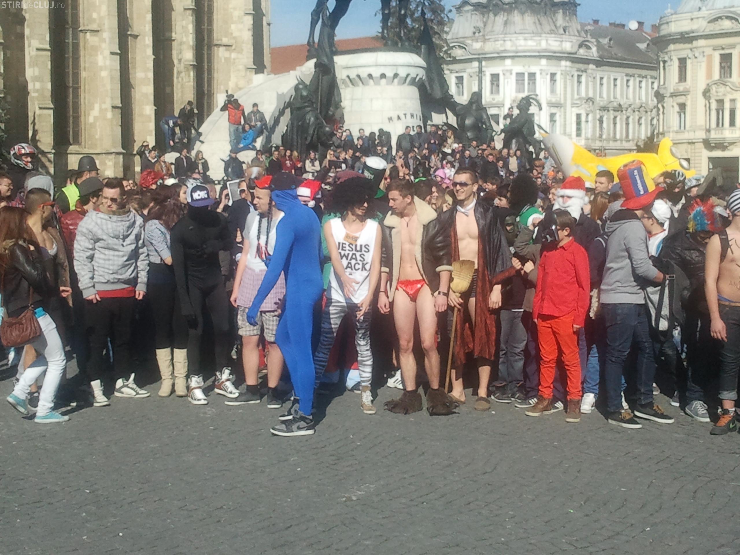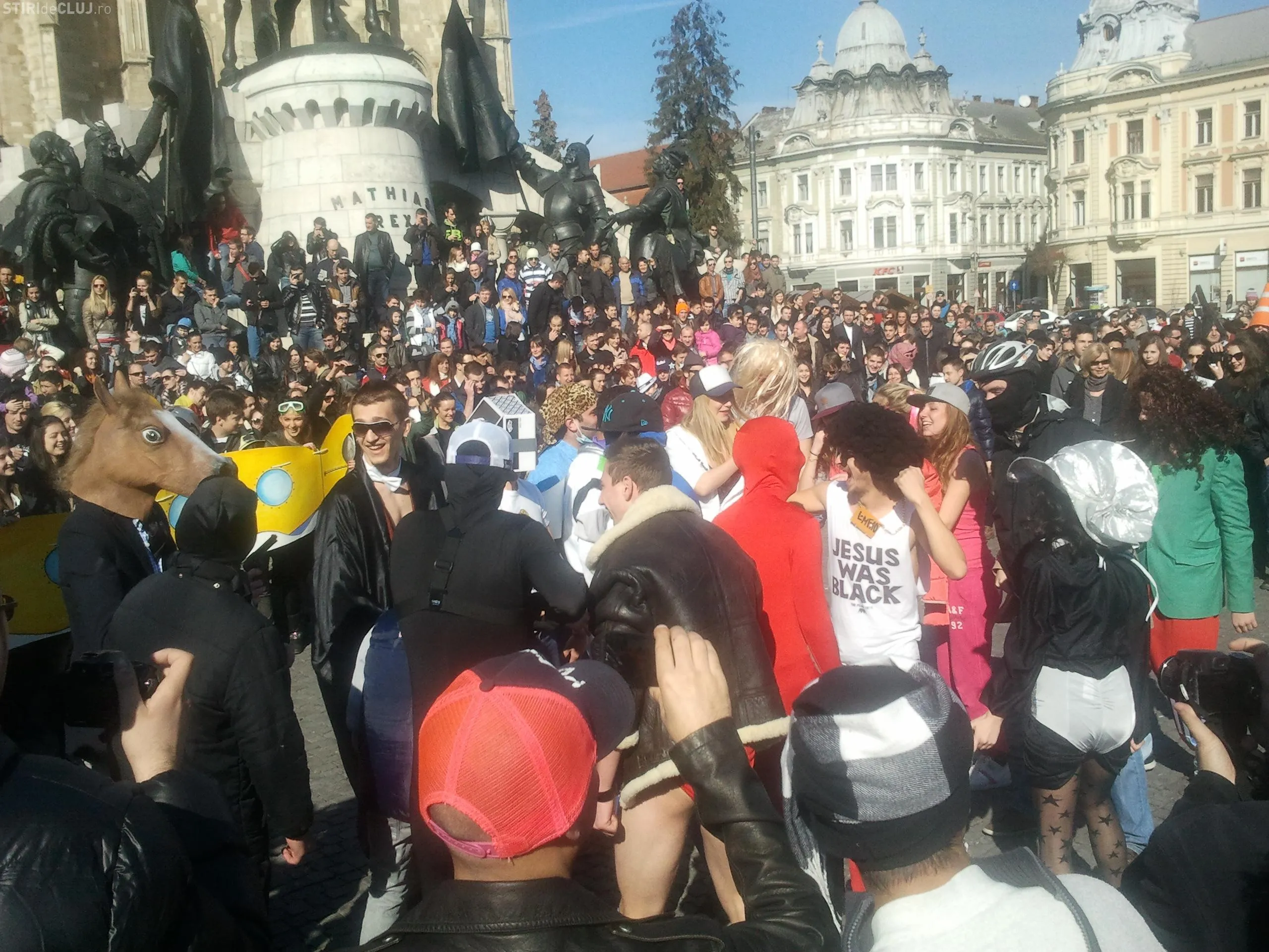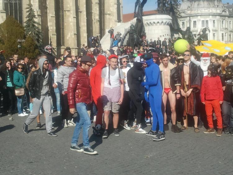 Harlem Shake în Piaţa Unirii din Cluj-Napoca. Peste 3.000 de tineri au dansat, duminică, 3 martie, pe ritmurile celebrei piese Harlem Shake. Costumaţia acestora a fost trăznită.