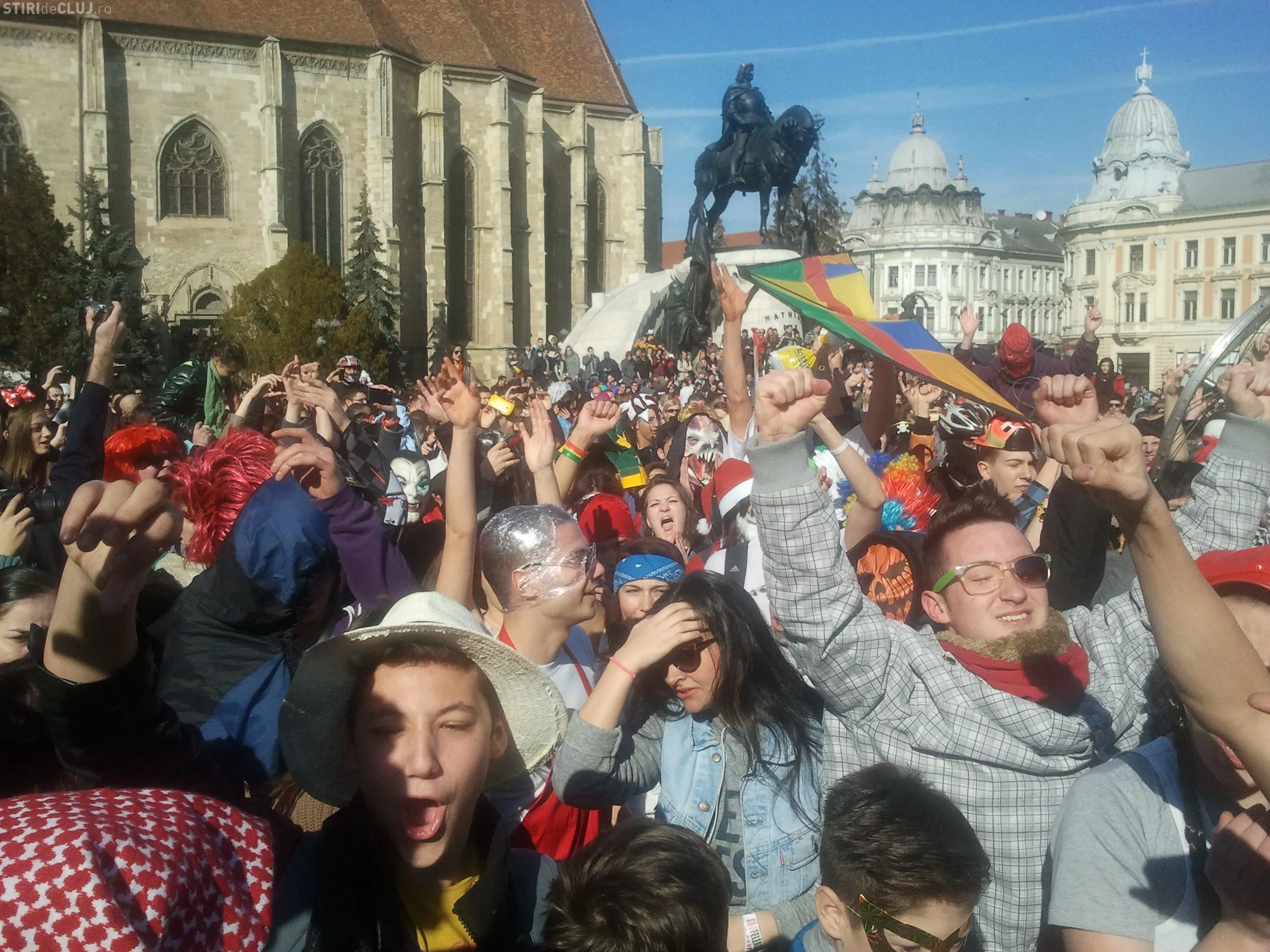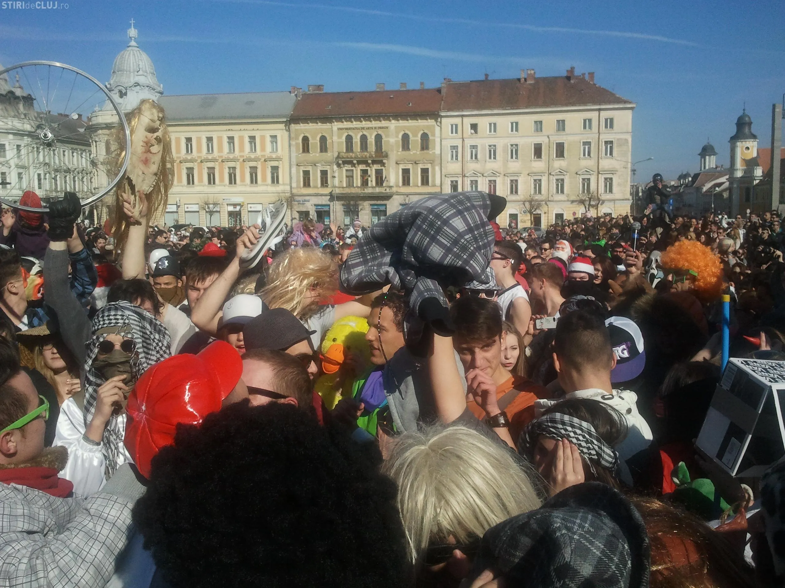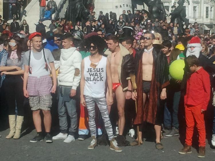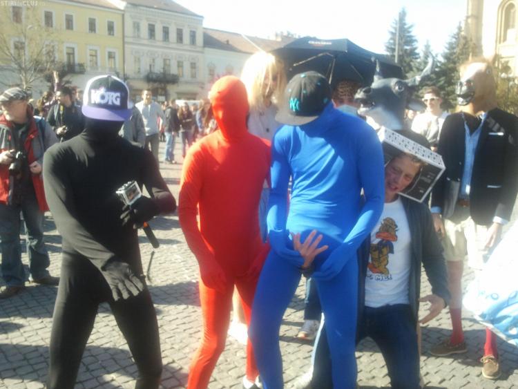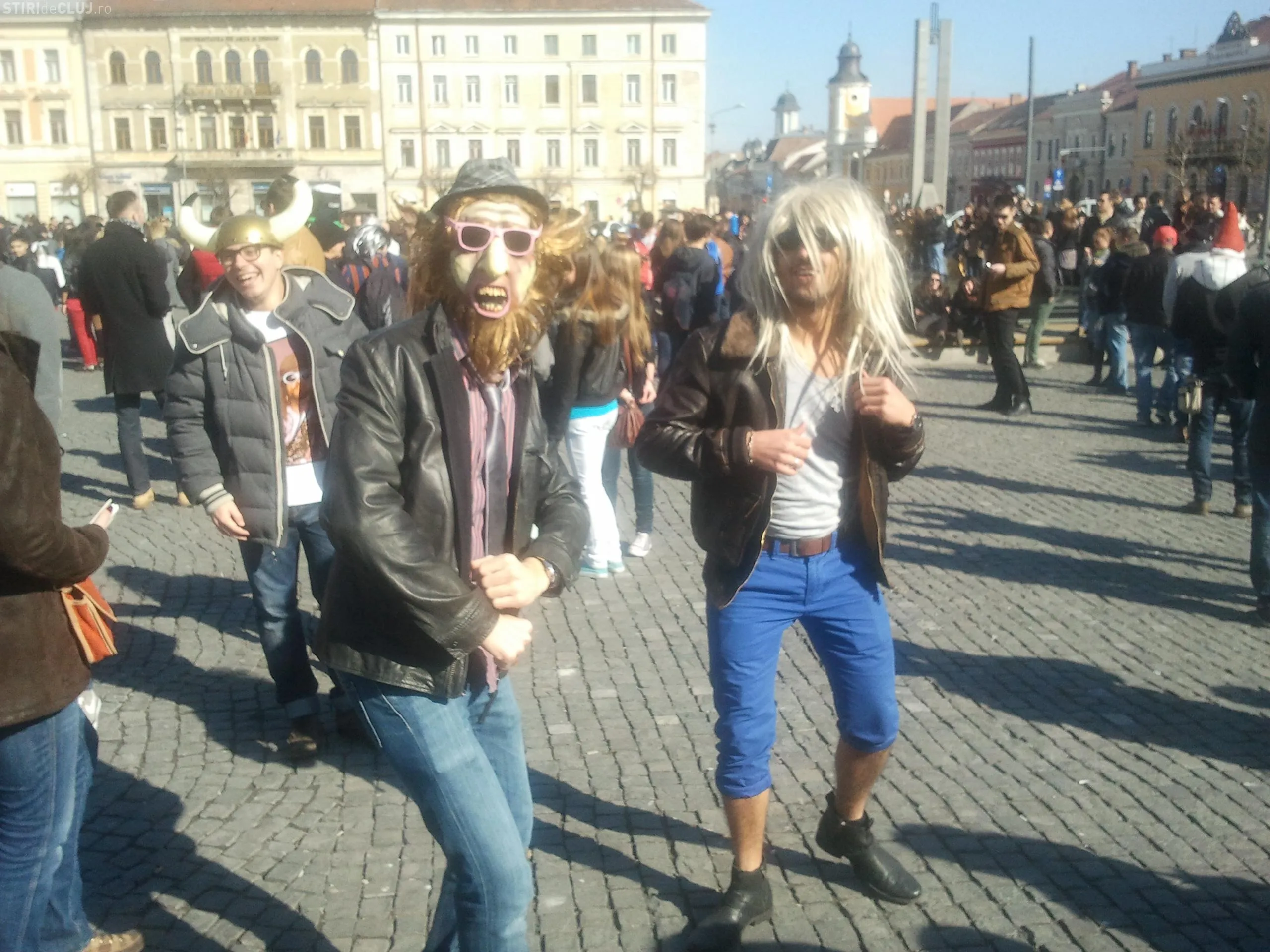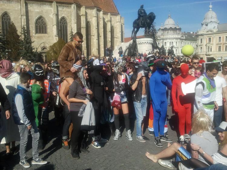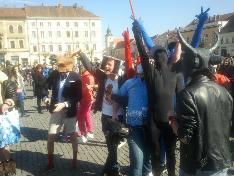 Harlem Shake în Piaţa Unirii din Cluj-Napoca. Peste 3.000 de tineri au dansat, duminică, 3 martie, pe ritmurile celebrei piese Harlem Shake. Costumaţia acestora a fost trăznită.