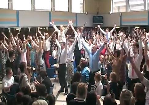 Ziua parea una normala pentru elevii de la Liceul Bell Baxter din Cupar, Fife. Directorul a dat tonul flashmob - ului, dar initiativa au avut-o elevii din clasa terminala, care au vrut astfel sa isi ia ramas-bun la terminarea scolii.