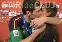 Iker Casillas, unul dintre eroii finalei cu Olanda, nu s-a mai putut abtine si a sarutat-o in direct la televiziunea spaniola pe Sara Carbonero, jurnalista de sport si iubita sa.