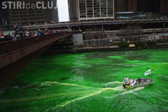 Apele unui râu din Chicago au fost colorate în verde de către muncitorii unei șalupe cu ocazia zile Sf. Patrick, din data de 16 martie.