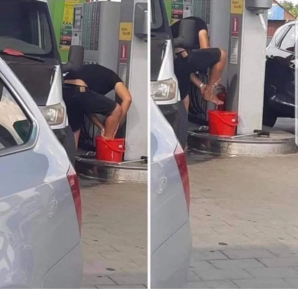 Un român a fost fotografiat într-o benzinărie în timp ce se spăla pe picioare în găleata cu detergent pentru parbrize.