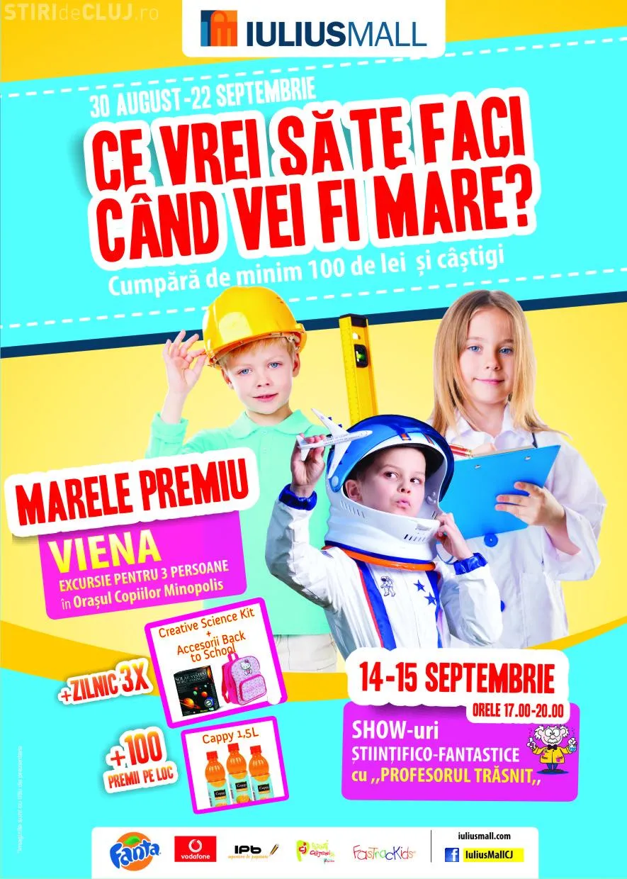 Mai sunt puţine zile până când clopoţelul va răsuna din nou în şcoli. Deşi vacanţa de vară se apropie de sfârşit, Iulius Mall Cluj îi invită pe elevi să petreacă zile de distracţie în laboratoarele ştiinţifico - fantastice special amenajate pentru ei şi să descopere ce vor să se facă când vor fi mari.