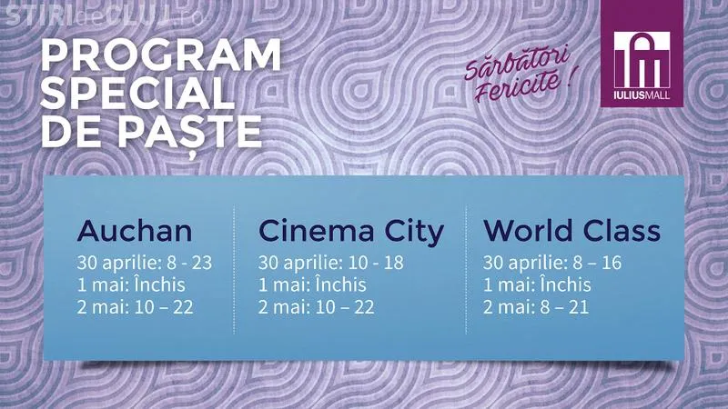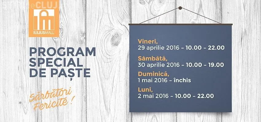 Sâmbătă, 30 aprilie 2016, magazinele din Iulius Mall îi așteaptă pe cei care nu și-au finalizat cumpărăturile de sărbători până la ora 19.00. Duminică, în prima zi de Paşte, mall-ul este închis. De luni, 2 mai, Iulius Mall revine la programul obișnuit, 10.00 – 22.00.