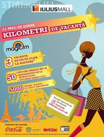 Tot la Iulius Mall, cei care isi doresc un safari in Africa, o vacanta in Dubai sau oriunde in Europa, transilvanenii pot ajunge in locul de vacanta la care viseaza daca fac shopping in Iulius Mall. Pana pe 30 iunie 2012, clientii primesc peste 5.000 de premii instant, alte 50 de GPS-uri SMAILO, abonamente V.I.P. la World Class, vouchere Marty City ori kilometri de vacanta alesi dintr-o lume de destinatii.