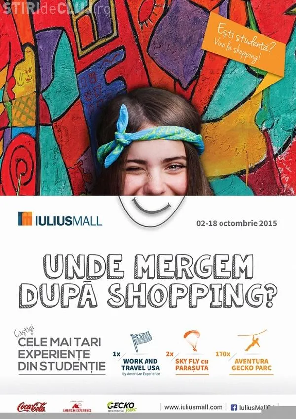 Dacă eşti student, până duminică, 18 octombrie 2015, cumpărăturile din magazinele preferate din Iulius Mall Cluj îţi pot asigura biletul către cele mai cool experienţe. Sesiunile de shopping în valoare de minimum 100 de lei îţi oferă şansa de a câştiga premii pe stilul tău.