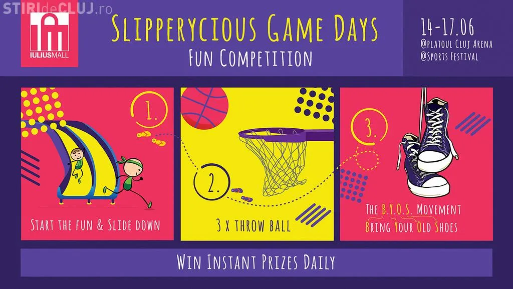Iulius Mall susține Sports Festival 2018, eveniment ce reunește cele mai îndrăgite sporturi, în perioada 14 – 17 iunie 2018, la Cluj-Napoca. Pentru că ne-am asumat misiunea de a încuraja un stil de viață activ, ți-am pregătit o competiție distractivă și energică. Indiferent de ce vârstă ai și care este sportul tău preferat, te așteptăm la „Slipperycious Game Days”, de joi până duminică, în intervalul orar 15.00 – 19.00, pe platoul Cluj Arena. Aici am amenajat o cursă cu obstacole, la care se vor „duela” câte doi concurenți simultan. Te poți înscrie direct la echipa Iulius Mall prezentă pe teren, dacă aduci o pereche de teniși vechi, cu șireturi, și un zâmbet larg.